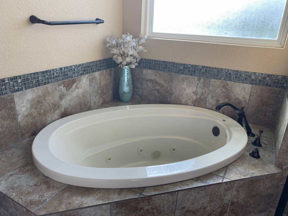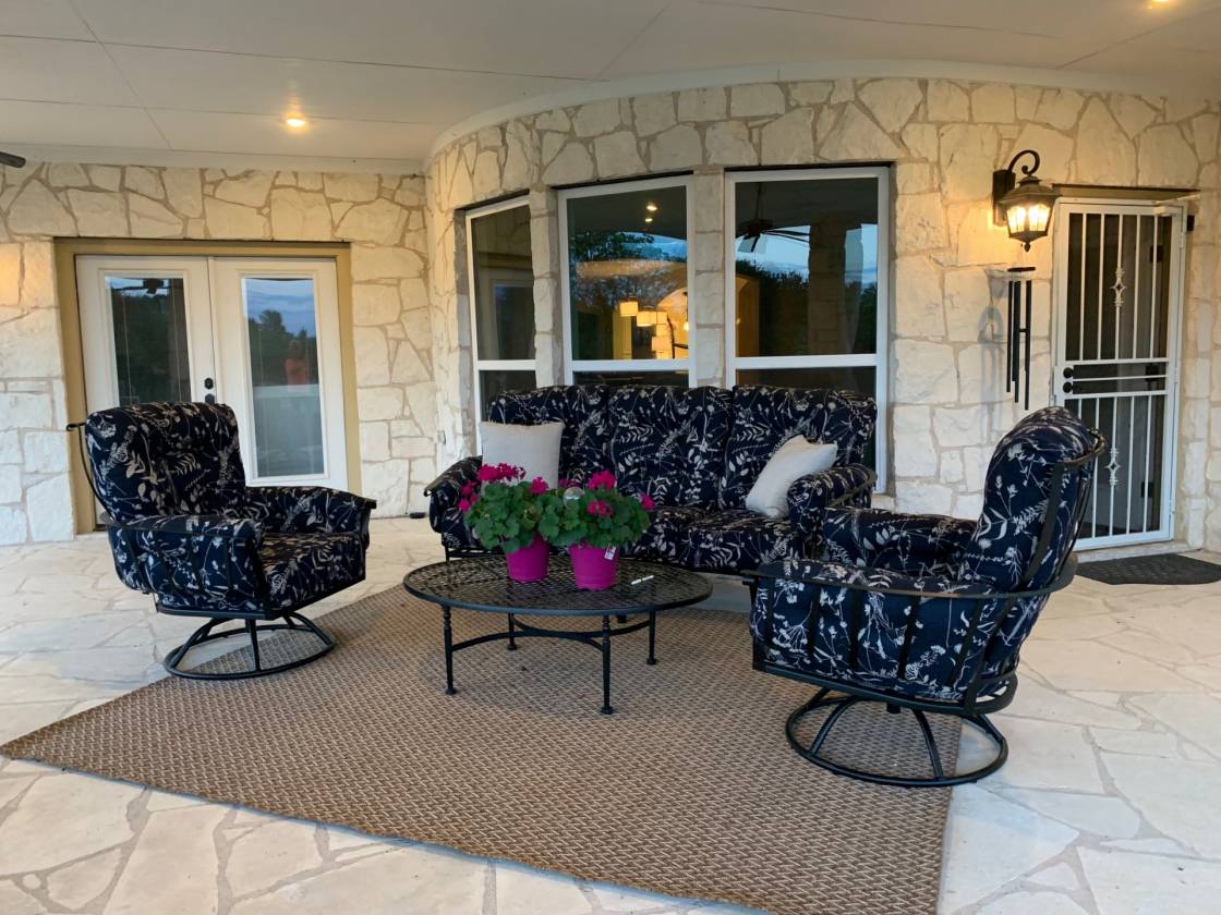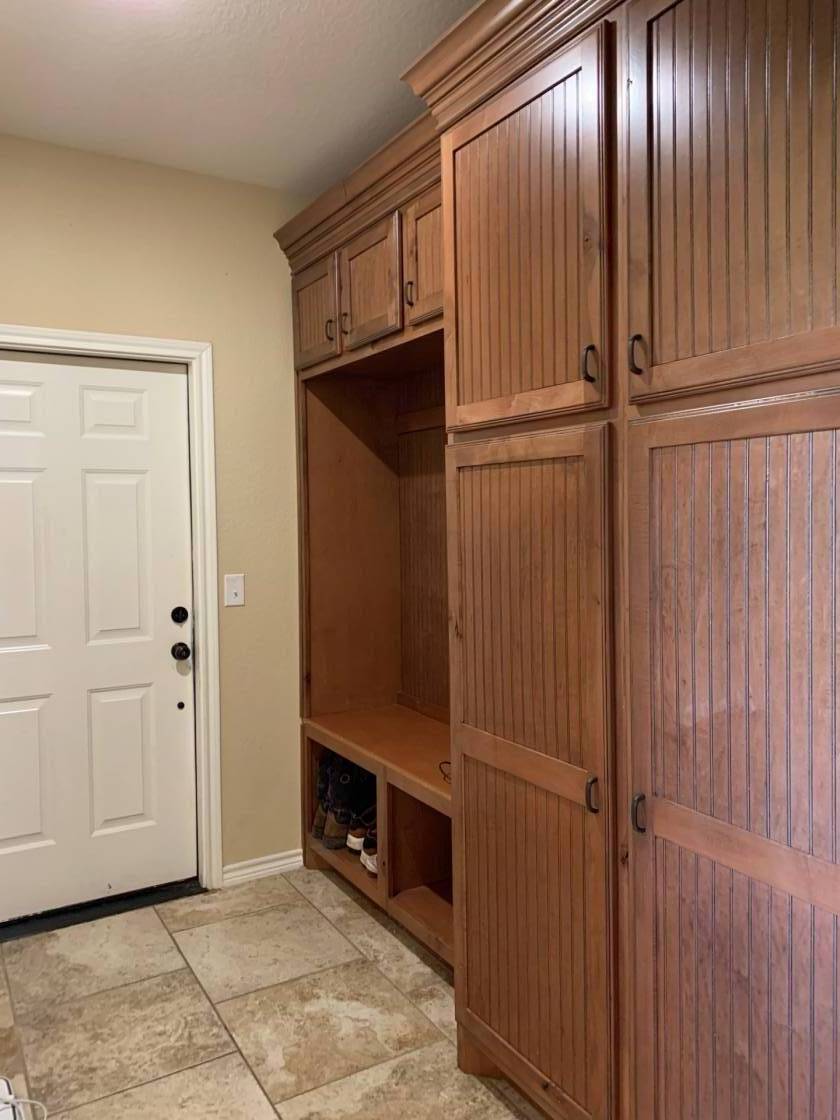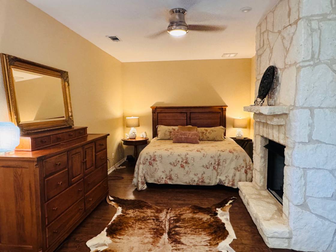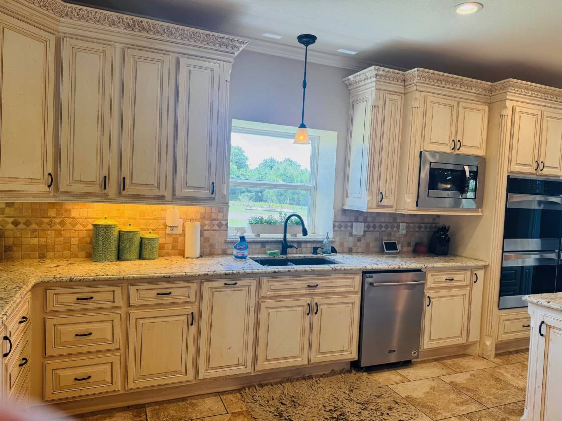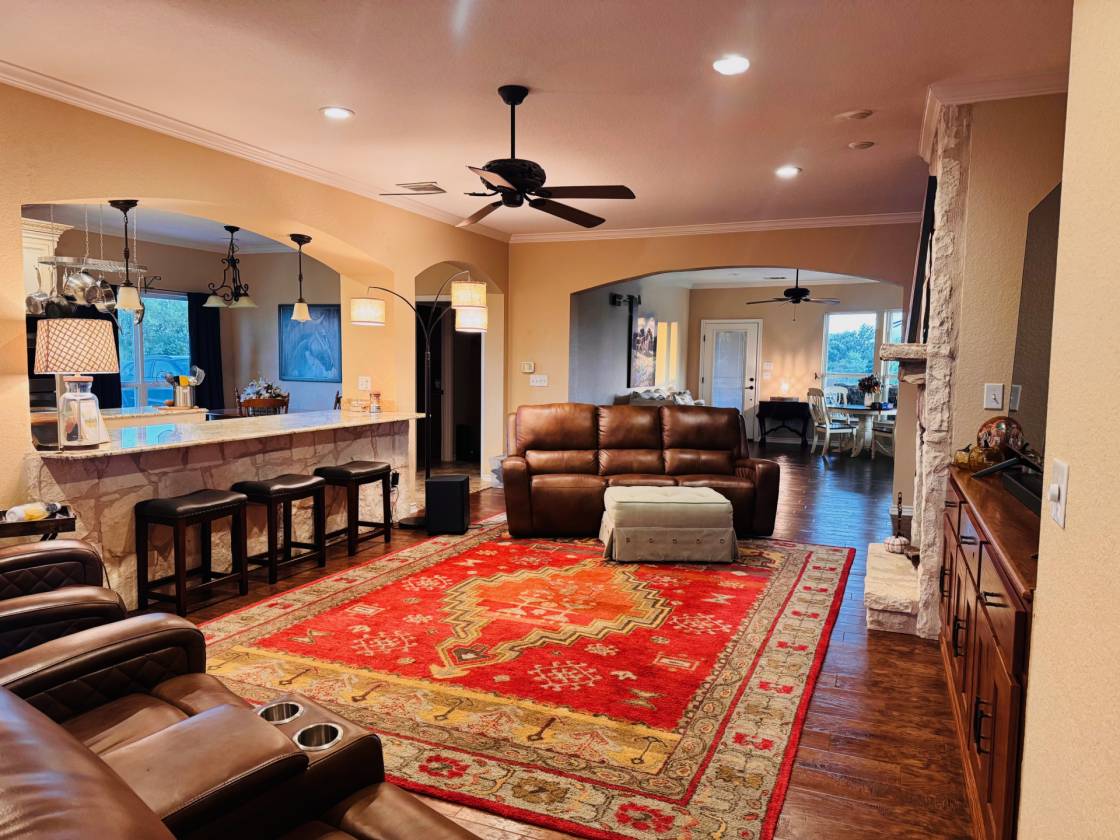 - Large kitchen with a big island, 4 convection ovens and custom finishes and cabinetry. Big living area with custom cabinetry built-in entertainment center. Large room sizes with custom built-ins throughout. 2 stone fireplaces. Beautiful sunroom with a curved wall of windows overlooking the stone patio. Primary bedroom with sitting area and doors leading to the patio. Enormous master bath with soaking tub and huge shower featuring dual showerheads and dual controls. Oversized home office with a raised ceiling and beautiful built-in cabinetry. Full bath in the garage to shower after working outside. Mud room and laundry room with a sink and freezer space. Huge stone patio for family gathering and wired for TV and sound for entertaining.