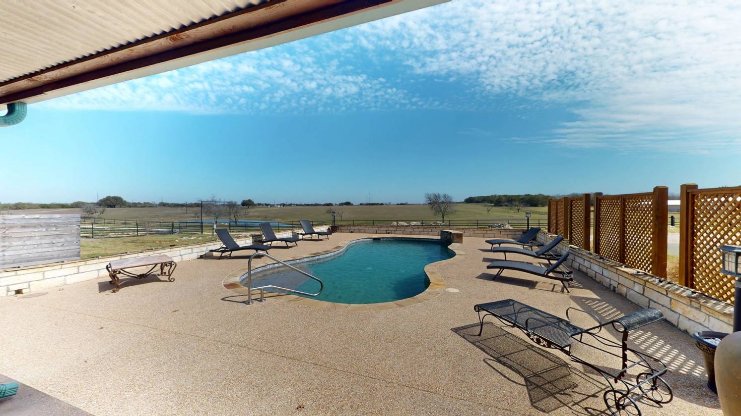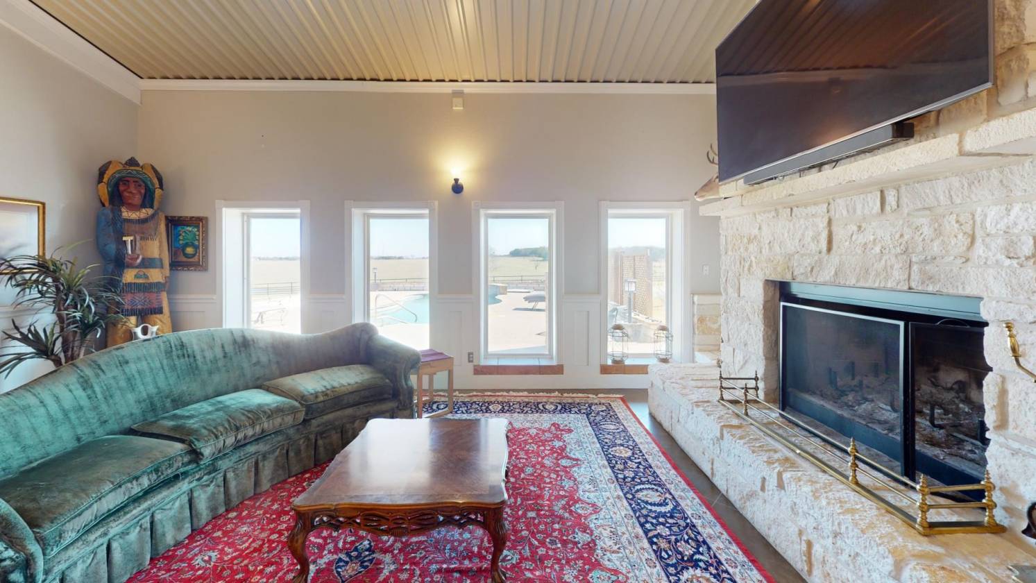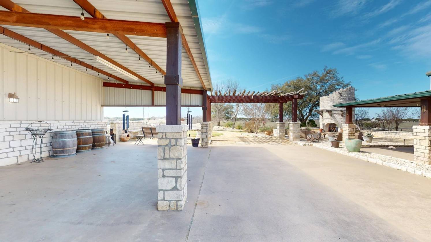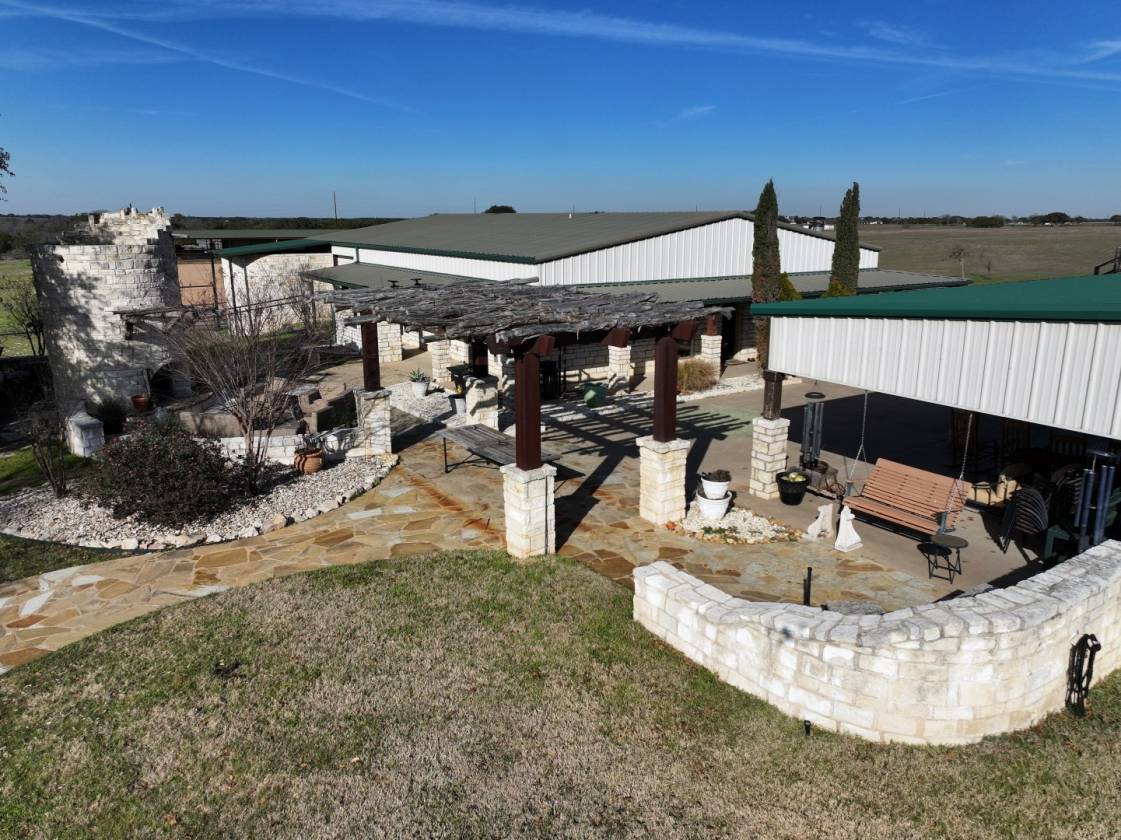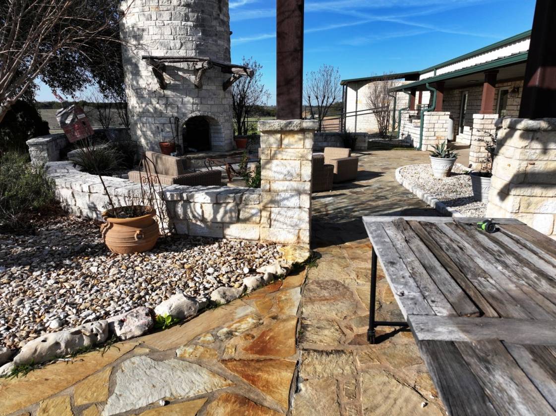 The outdoor stone fireplace and patio under lighted trees create an inviting space for relaxing or entertaining. With stunning sunrises and sunsets, this hilltop retreat provides a peaceful escape while still being just minutes from China Spring and Waco.