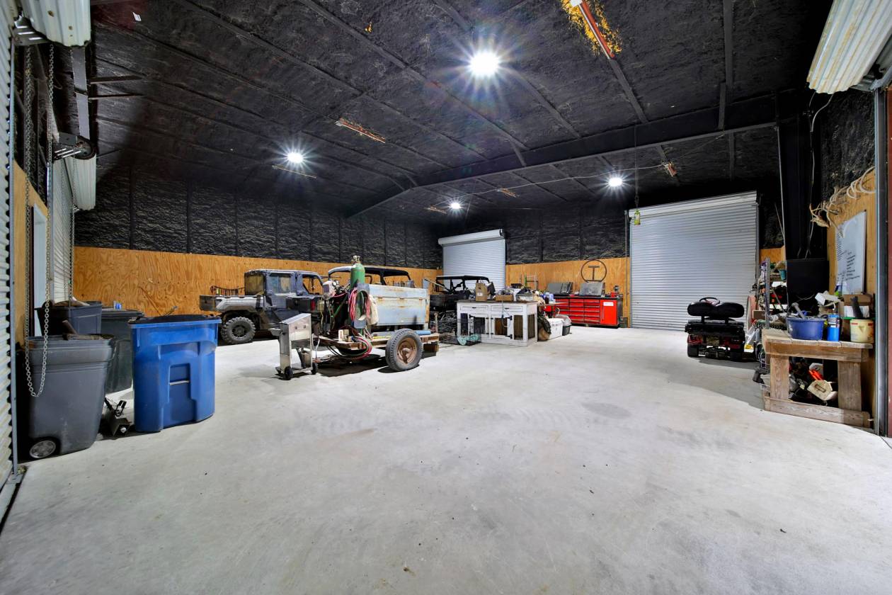 - SHOP details 48 X 56 fully enclosed, spray foamed, concrete floor, 4 large roll up bay doors 2 on each end. Electrical