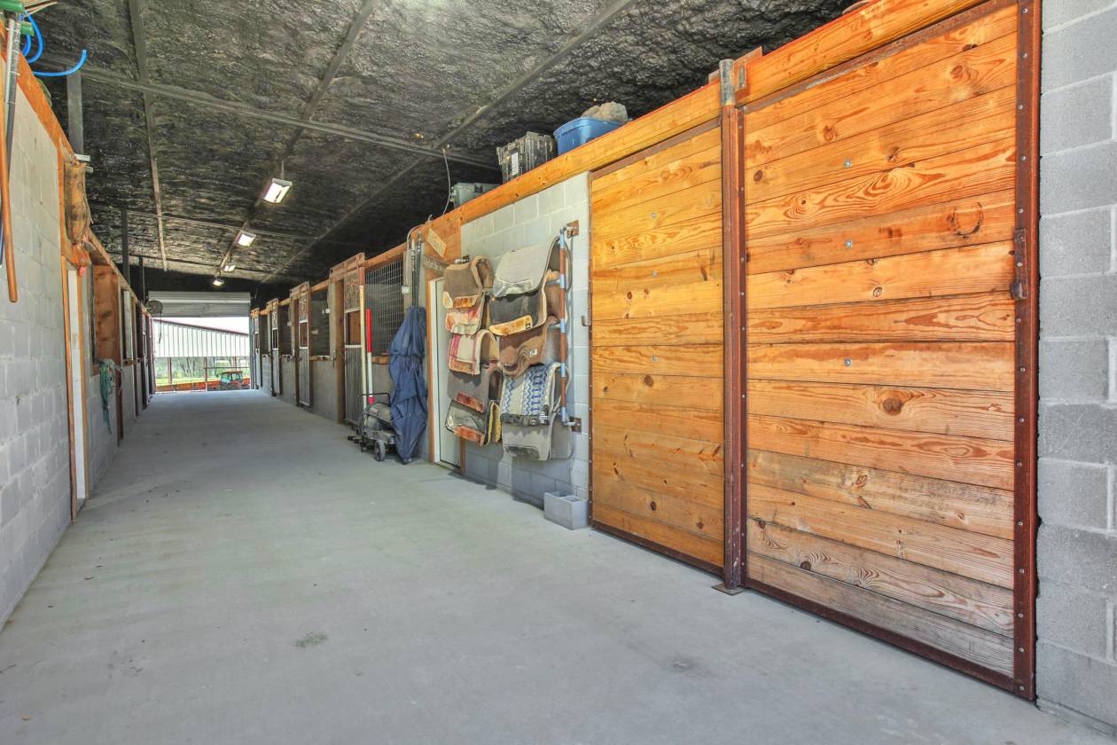 - with concrete floors, 8 enclosed horse stalls all with automatic waterers, lighting & fans, solid cinderblock wall, spray foamed,