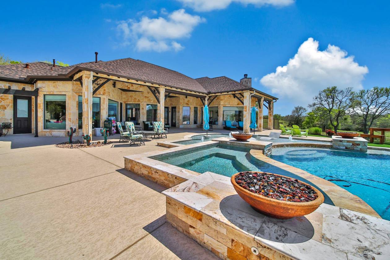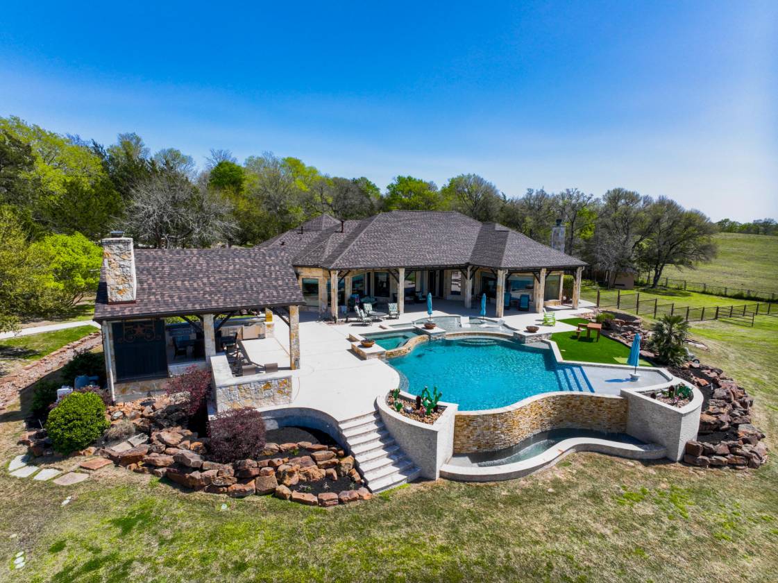 Nestled on 42+ breathtaking acres, this ranch offers unparalleled rustic charm, privacy & stunning sunset views. Zoned MISD schools. Gated entry and private drive lead to magnificent custom all stone home. Inside, rich wood accents, trayed ceilings & expansive windows showcase picturesque views, while open-concept living space boasts grand stone fireplace, gourmet island kitchen w/Thermador appliances & cozy breakfast room. Master suite is serene retreat w/scenic windows & spa-like ensuite bath. Additional highlights, home office, game room, extra room w/built-ins & secondary bedrooms and baths. Outdoors, resort-style pool/spa, covered patio, outdoor kitchen, putting green, skeet shooting deck, charming bunkhouse (3 bed/2bath), shop, barn w/horse stalls and tack room & both indoor/outdoor arenas. Property features stocked pond & whole-home generator. Ag exemptions in place & an extensive list of amenities make this property truly one-of-a-kind—see attachments for details!!