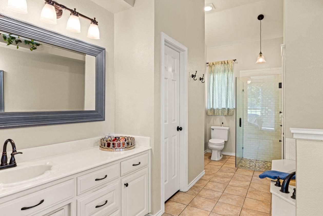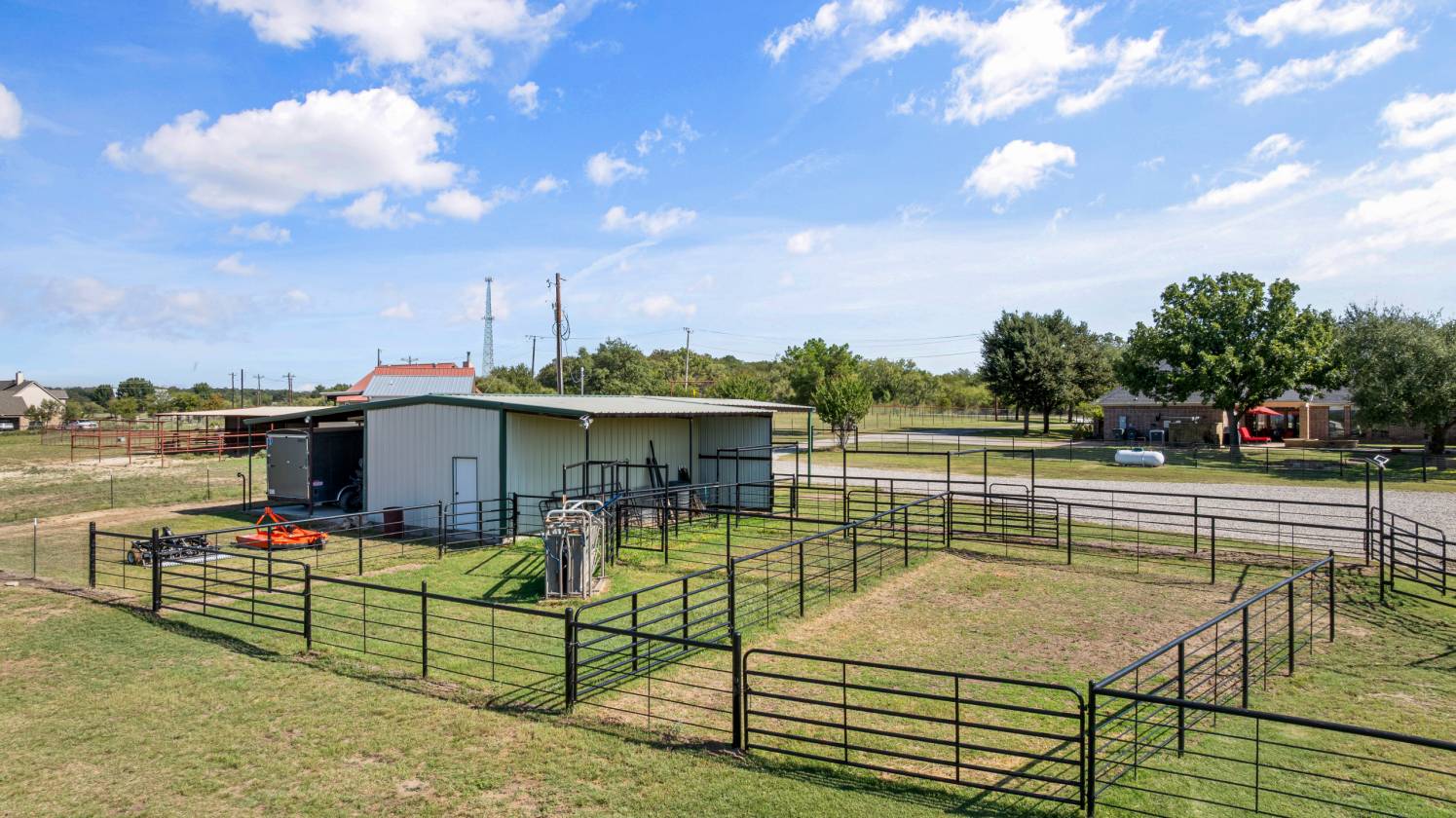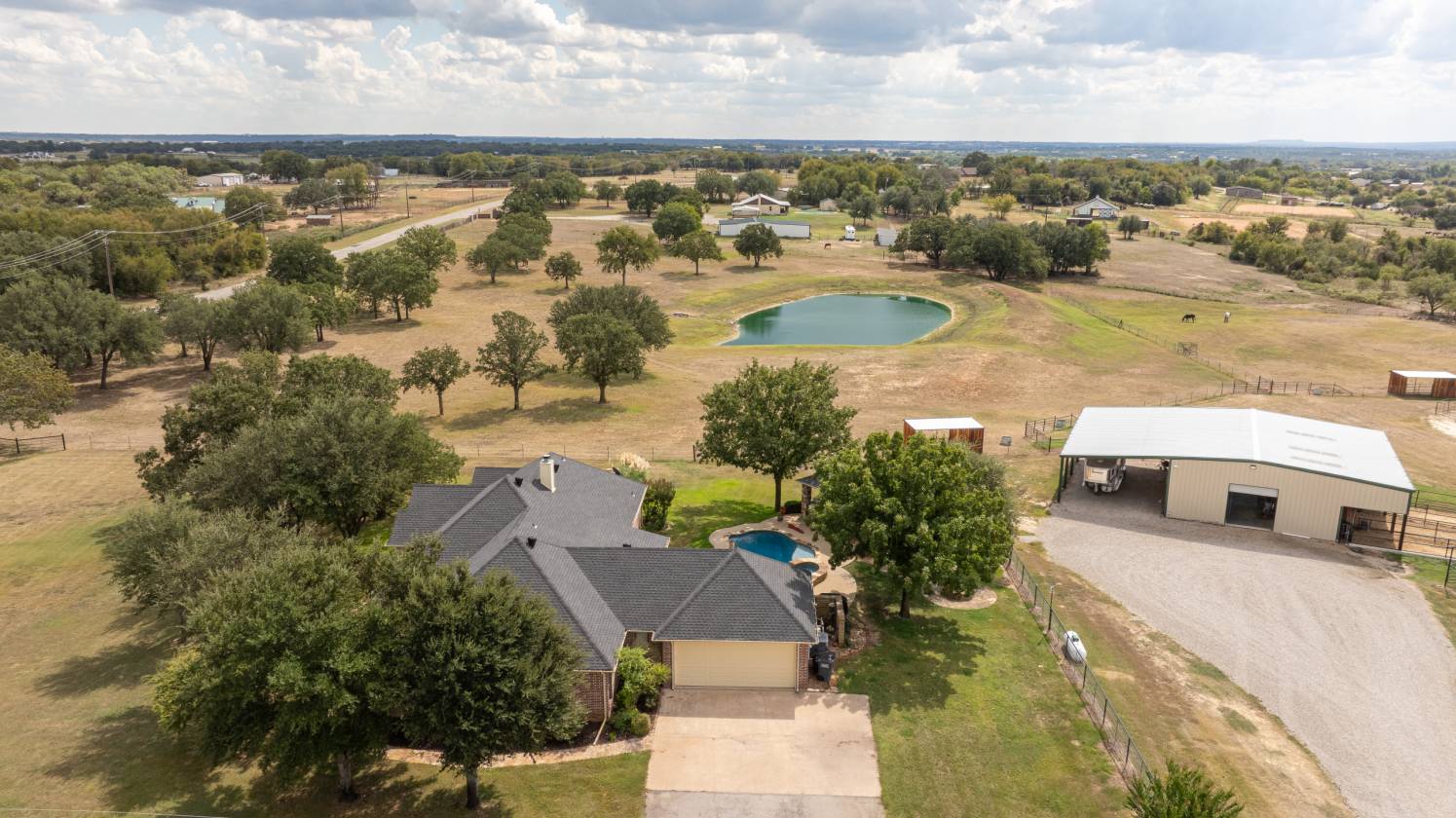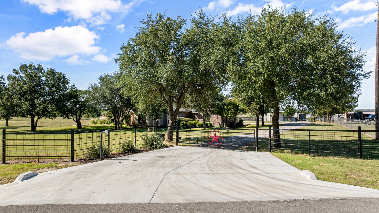 Welcome to 5444 Meadow Ridge Drive, a horse enthusiast’s dream on 9.98 acres with beautiful trees, a stocked pond with bass and catfish, and cross-fenced coastal pastures for horses and cattle. Designed for both comfort and function, this property makes daily living and livestock care easy and enjoyable. At the heart of it all is a spacious 4-bedroom, 3.5-bath home with a split-bedroom layout, two living areas, an open dining space, and a breakfast nook off the kitchen. The main living area features a stone fireplace, while the second offers large windows overlooking the pool—perfect for watching the game, hosting guests, or using as a game room. The versatile 4th bedroom is currently used as an office. Interior updates include fresh paint, new appliances, updated HVAC, and a whole-house attic fan. Outdoors, enjoy a PebbleTec saltwater pool and spa with LED lighting, rubber-coated decking, and a cabana with TV and Bluetooth speakers. The fire pit sits just beyond, creating the perfect spot to gather under the stars and take in the wide-open views. The 36x50 barn includes three 12x12 stalls, 12’x30’ covered runs, tack room, storage, wash area with tie rack and Priefert stocks, turbo fans, and a fly spray system. Attached is a 24’ covered parking area with 50-amp RV plug. A 20x30 workshop offers lean-tos on each side for covered parking, extra storage, and another 50-amp RV plug. Even more parking is available with the attached 20x25 covered area, ideal for equipment or trailers. Working pens, squeeze chute, 150’x180’ panel arena, and 50’ round pen complete the setup. Three electric gates provide secure access to the home, barns, and pastures. All of this is 10 minutes from Weatherford, 15 minutes to Teskey’s, and 45 minutes to Fort Worth—offering the perfect blend of country charm, functionality, and convenience.