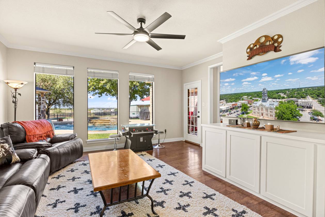 - Second living area with built-in cabinets and large windows facing the pool.
