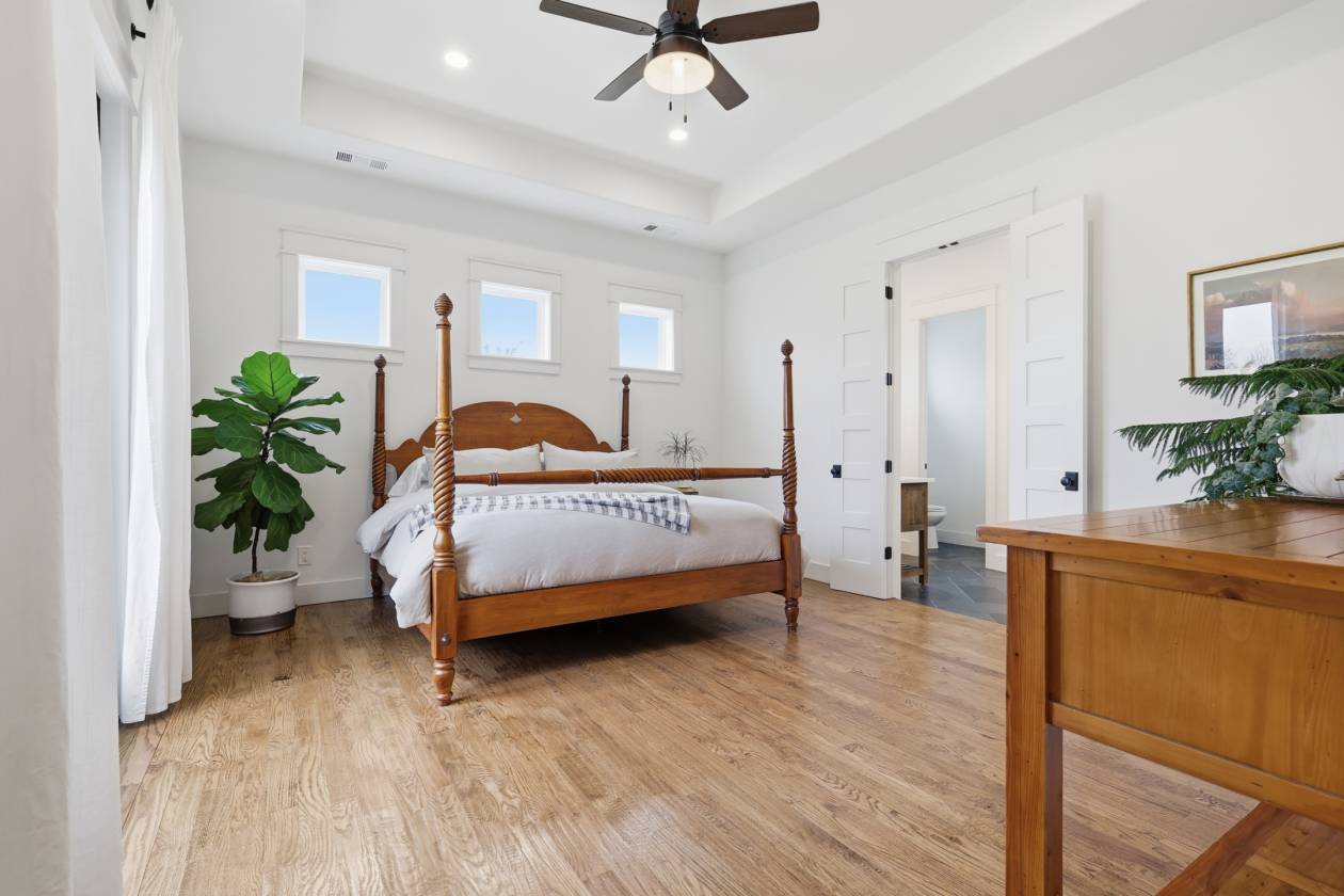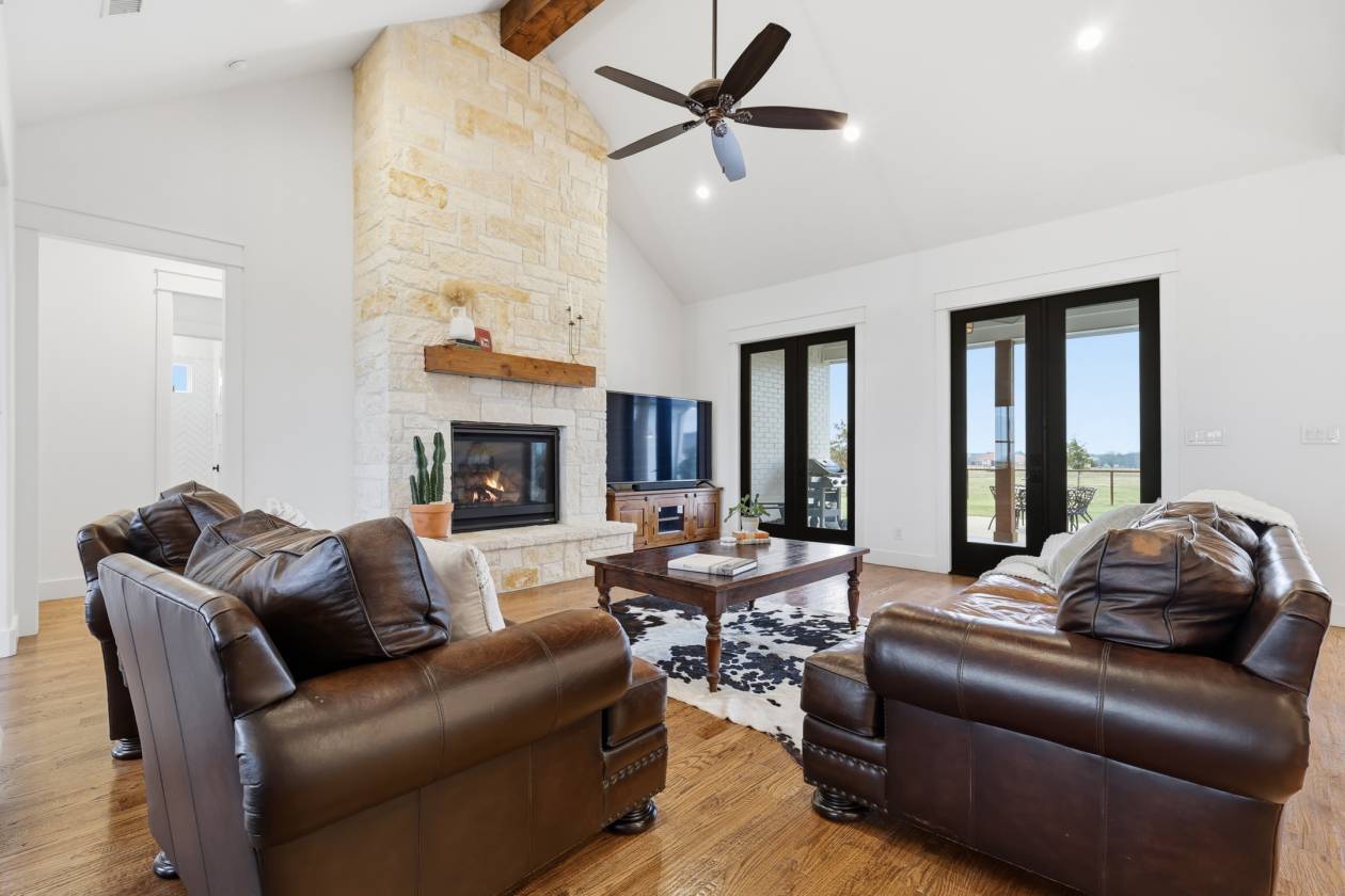 - Inside, the home lives beautifully with a 100% custom-crafted interior, from its artisan cabinetry to the warm wood-beamed ceiling and floor-to-ceiling stone fireplace that anchors the living space. The open floorplan invites effortless entertaining, while the split-bedroom layout provides privacy and a relaxed, lifestyle-friendly flow.