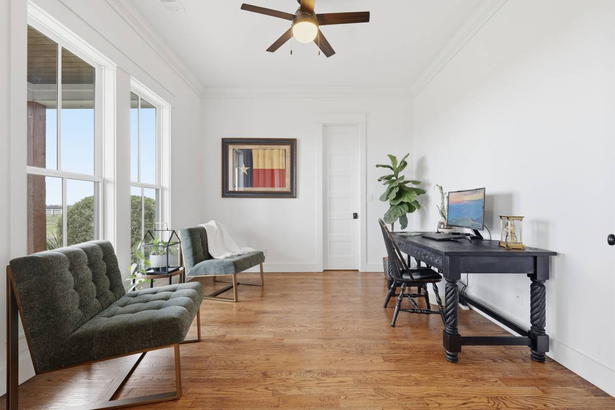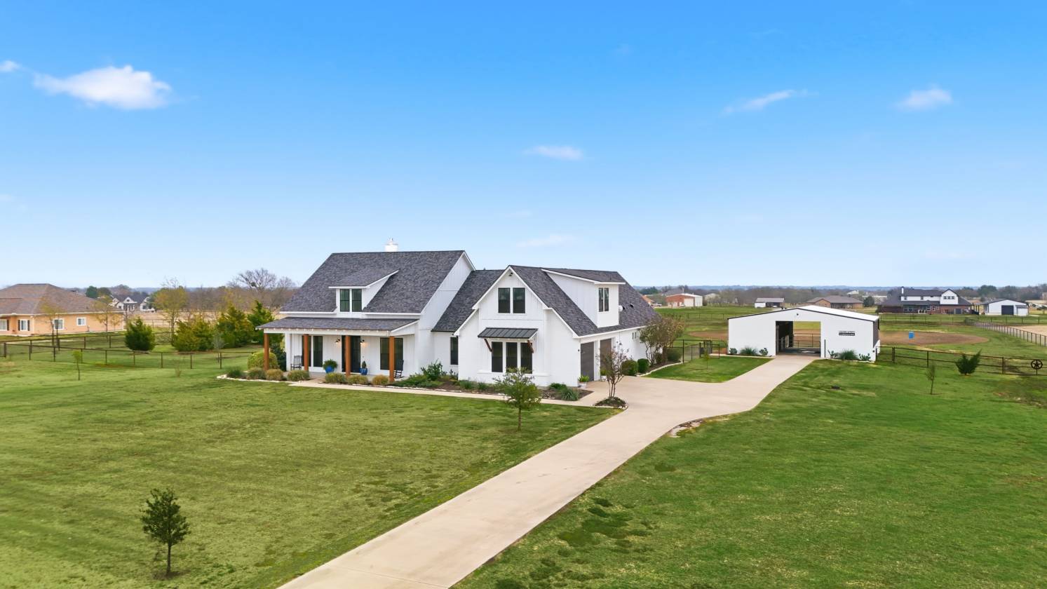 Where Modern Luxury Meets True Horse Country Living! Welcome to your Modern Farmhouse retreat—a like-new 5-acre horse ranch in Rockwall County created for those who cherish their beloved furry companions and the freedom of country living. Why build when this thoughtfully curated dream home can be yours in just a few months? Relax on the wide front-porch rocking chairs or unwind on the back patio while your horses graze across open pasture, cool off in the shaded loafing shed, or train in the 80’ x 100’ cushion-sand practice arena. The like-new 4-stall barn has been designed for smooth, streamlined routines—with two 14' steel roll-top doors that allow drive-through truck access to the back pasture and arena, a dedicated tack room, hay and feed storage, and a convenient side passage door for backyard access without opening the large bay doors. Plenty of room, practicality, and thoughtful design make caring for your equine family a breeze.
