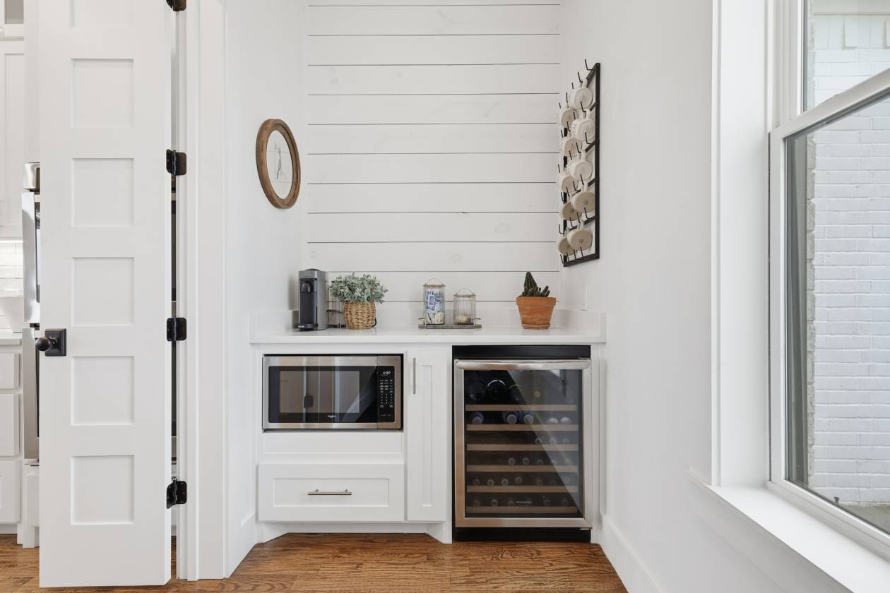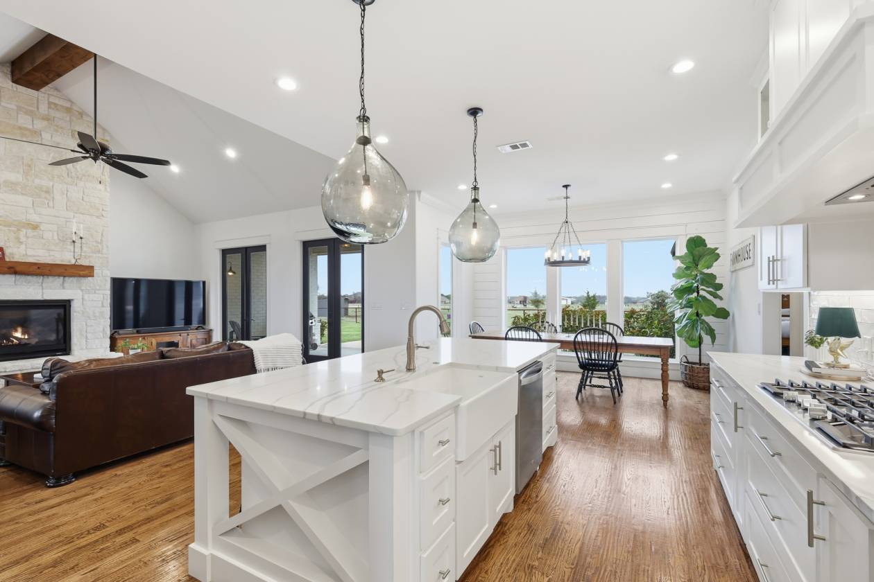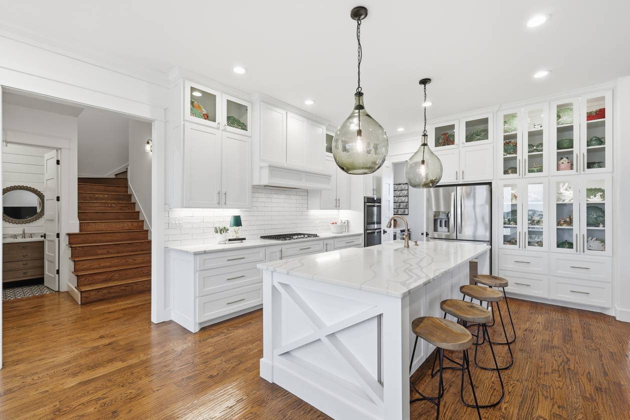 - The dream kitchen becomes a reality with pure-white custom cabinetry, gleaming quartz countertops, a huge center island, elegant glass-front display cabinets, and a perfectly appointed butler’s pantry—an ideal blend of style and function for everyday living or entertaining. The barely lived-in home is elevated with designer finishes, a chemically injected piered slab foundation, and open-cell spray foam insulation for long-term comfort and efficiency.