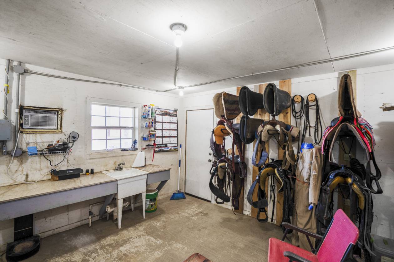 - A 30'x45' barn includes a Feed and tack room (insulated, temperature-controlled) with sink (15'x15'), a Veterinarian rack/stock, and 2 stalls. (Electricity, water).