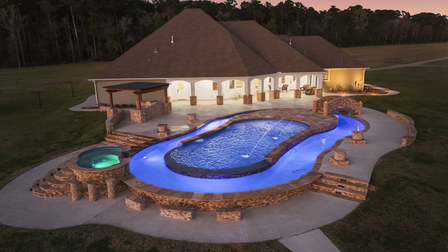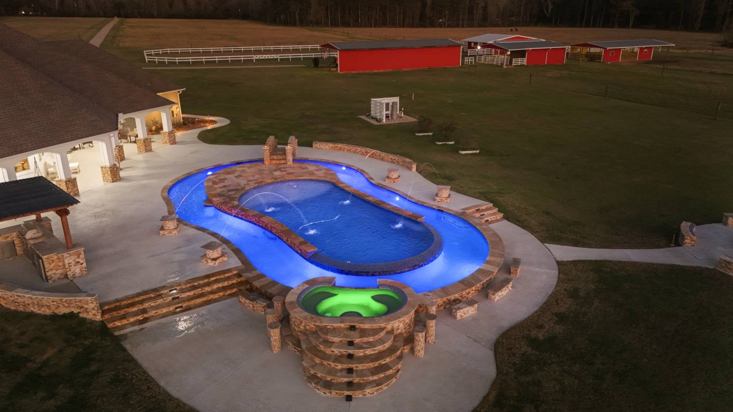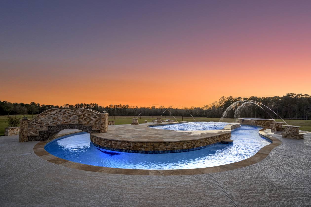 - Amazing custom resort-style pool, lazy river, and spa with special lighting, inlaid tile, water fountains, bridge, and Offset firepit. Built-in Bar-top seating around spa, built-in seating around pool, and a firepit.