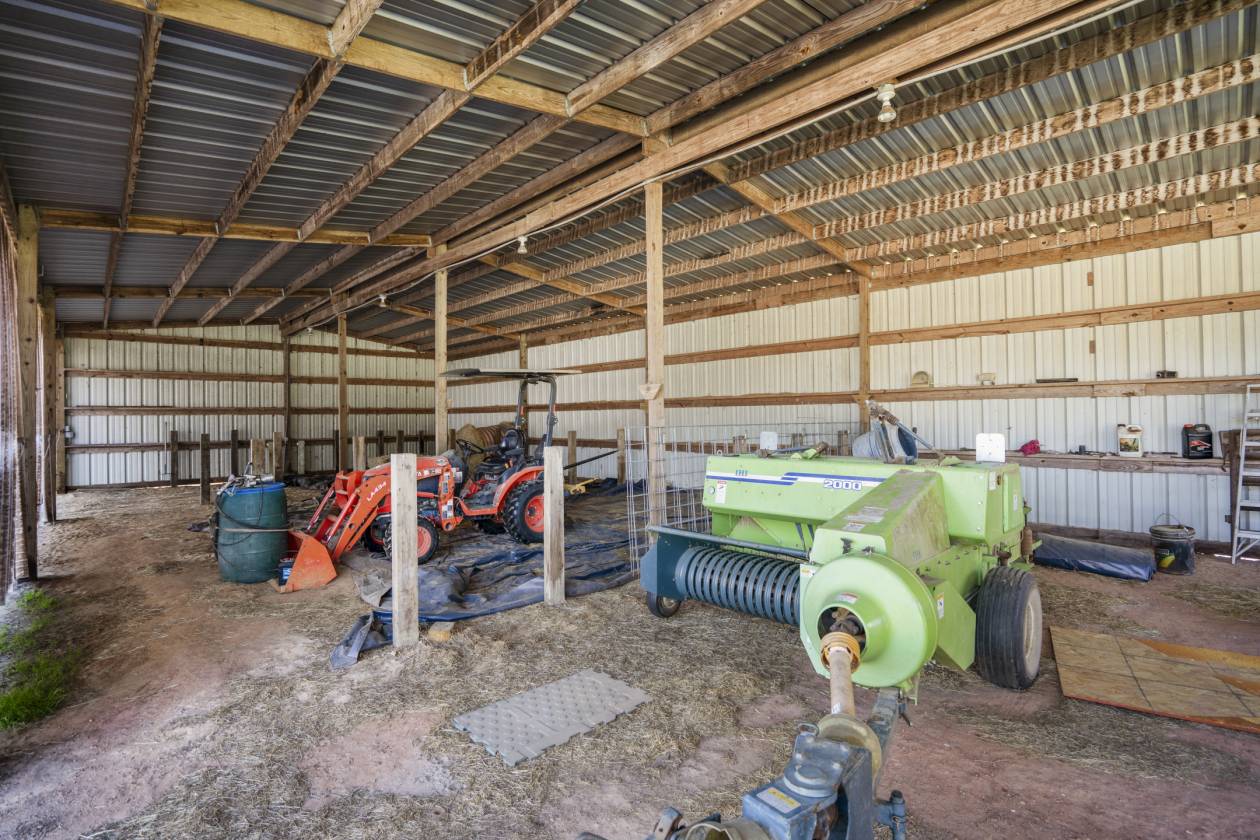 - 30x57' dirt floor barn, with 4 stalls and 1 run-in "overhang roof" (Electricity, water).