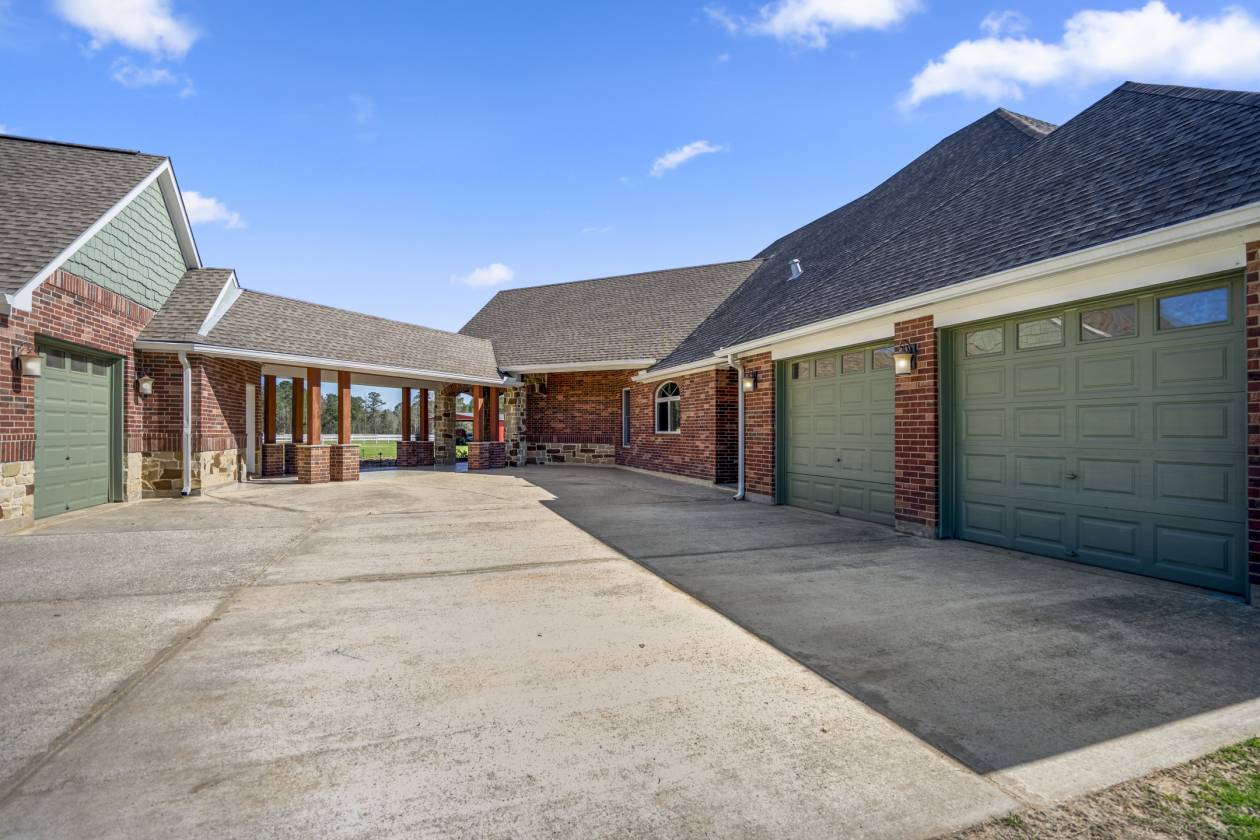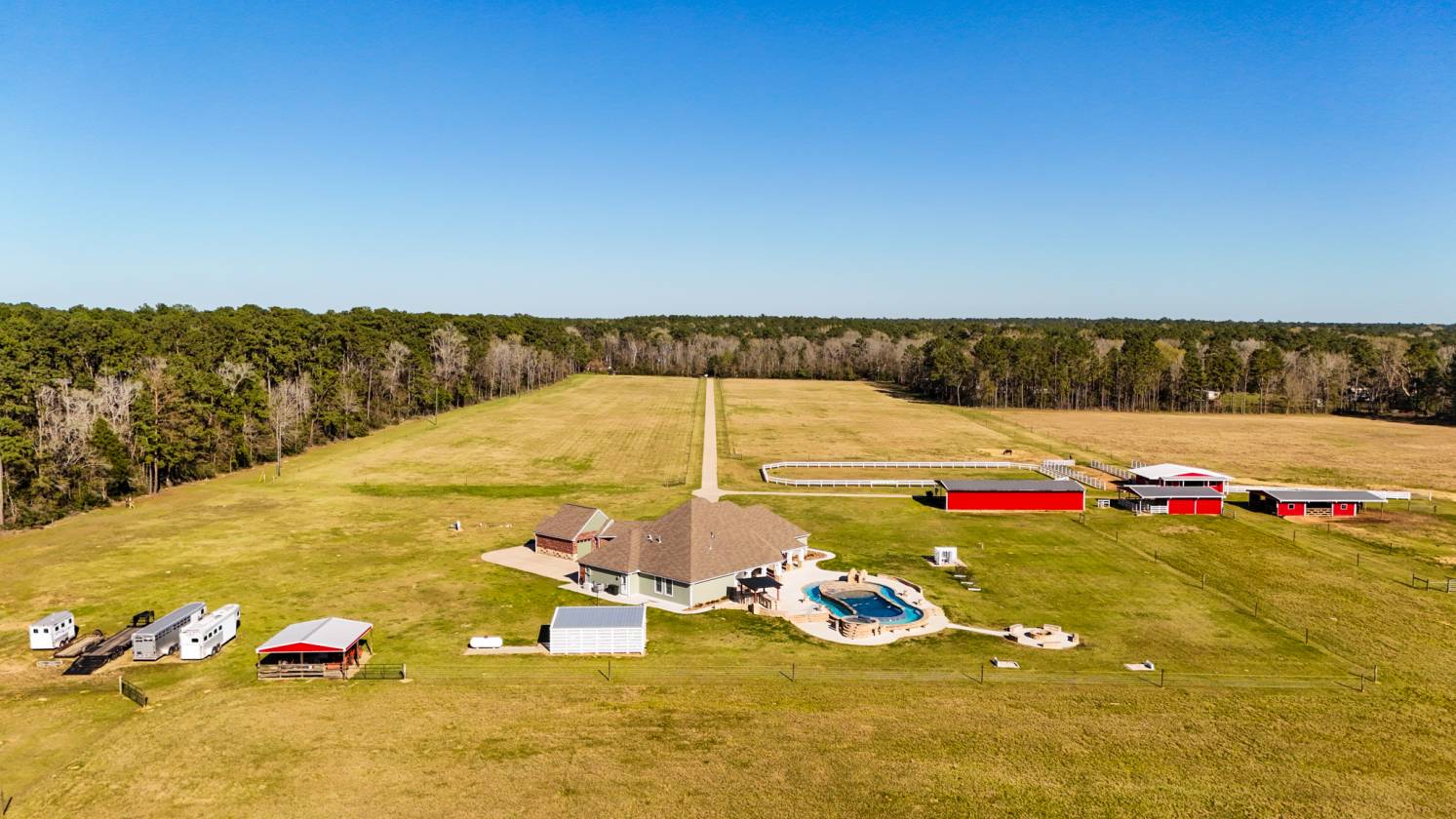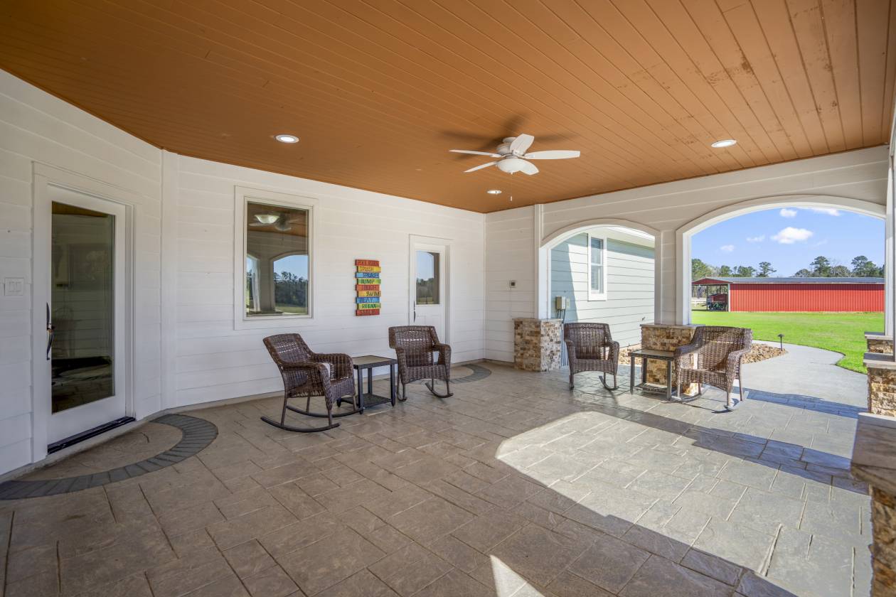 - Extensive covered patio with gorgeous views of pool, pastures, and barns.