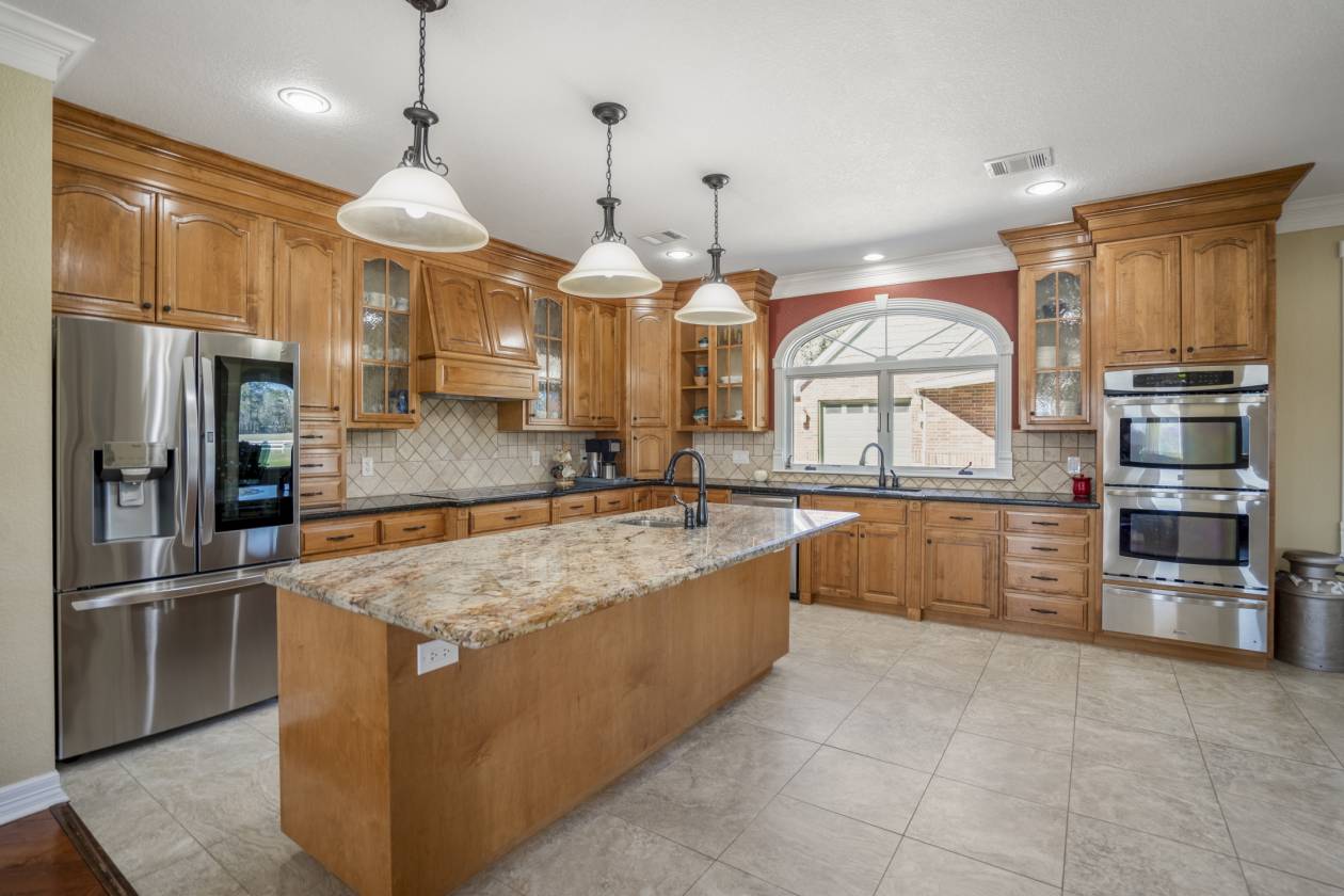 - The kitchen offers a double oven and two sinks in an open floor plan with granite countertops.