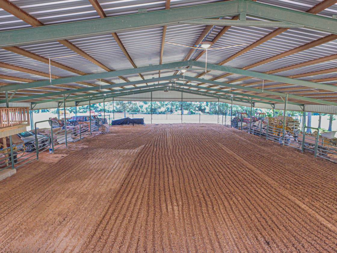 - This Equestrian Facility would easily be adaptable to any breed or equine discipline. The 70x150 indoor arena is equipped with a sprinkler system on timers with well-maintained excellent ground. There is a 2/1 trainer's apartment overlooking the indoor arena. The Owner has not put stalls in this barn but has left ample room for numerous stall (20+) with several gates from this area into the arena. All in pipe fence with several pasture runs radiating off of the barn and stall area. The outdoor arena is 120x210. It connects to the indoor arena at the back of the barn could be used to extend the indoor arena or as a training area.