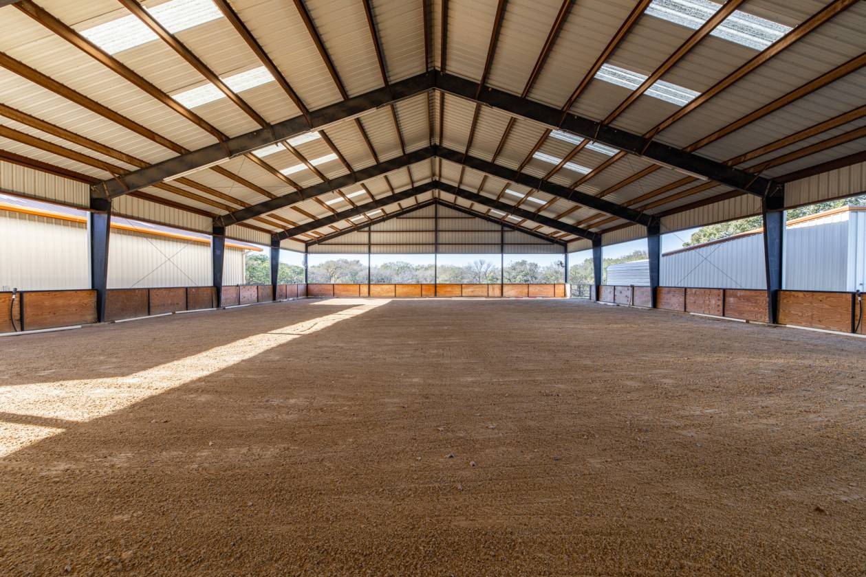 - From the house, follow the concrete driveway toward the barn. This drive is bordered on one side by a beautiful pasture with a pipe fence. The barn has six 12×12 stalls and one foaling stall, all of which have individual turnouts. Attached to the barn is a fully covered and irrigated riding arena, and adjacent to the barn is an additional turnout for grazing and a round pen for training. Just next to the barn is an additional shop storage that is fully enclosed and insulated with concrete floors.