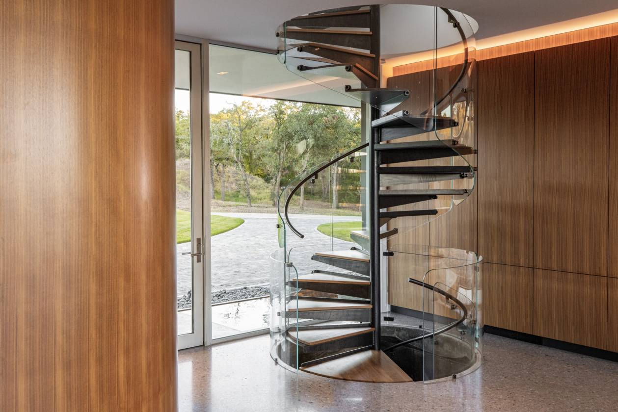- Journeying up and down the custom-built metal framed staircase is an artistic treat in itself. Going up the stairs to the second floor viewing area re-emphasizes the stunning views of the grounds and surrounding area, complete with a dishwasher, fridge/freezer/icemaker, a dumbwaiter, and floor to ceiling windows and doors that open to a covered porch and roof top IPE deck. The lower level of the home features an acoustically balanced theater with Dynaudio speakers and sound system designed by Ember Audio to provide a true movie theater experience from the comfort of your own home. The theatre is complete with a 250-bottle wine cooler, 8 ft concert walls, and a powder bath. All of which could also be used as a very nice storm cellar.