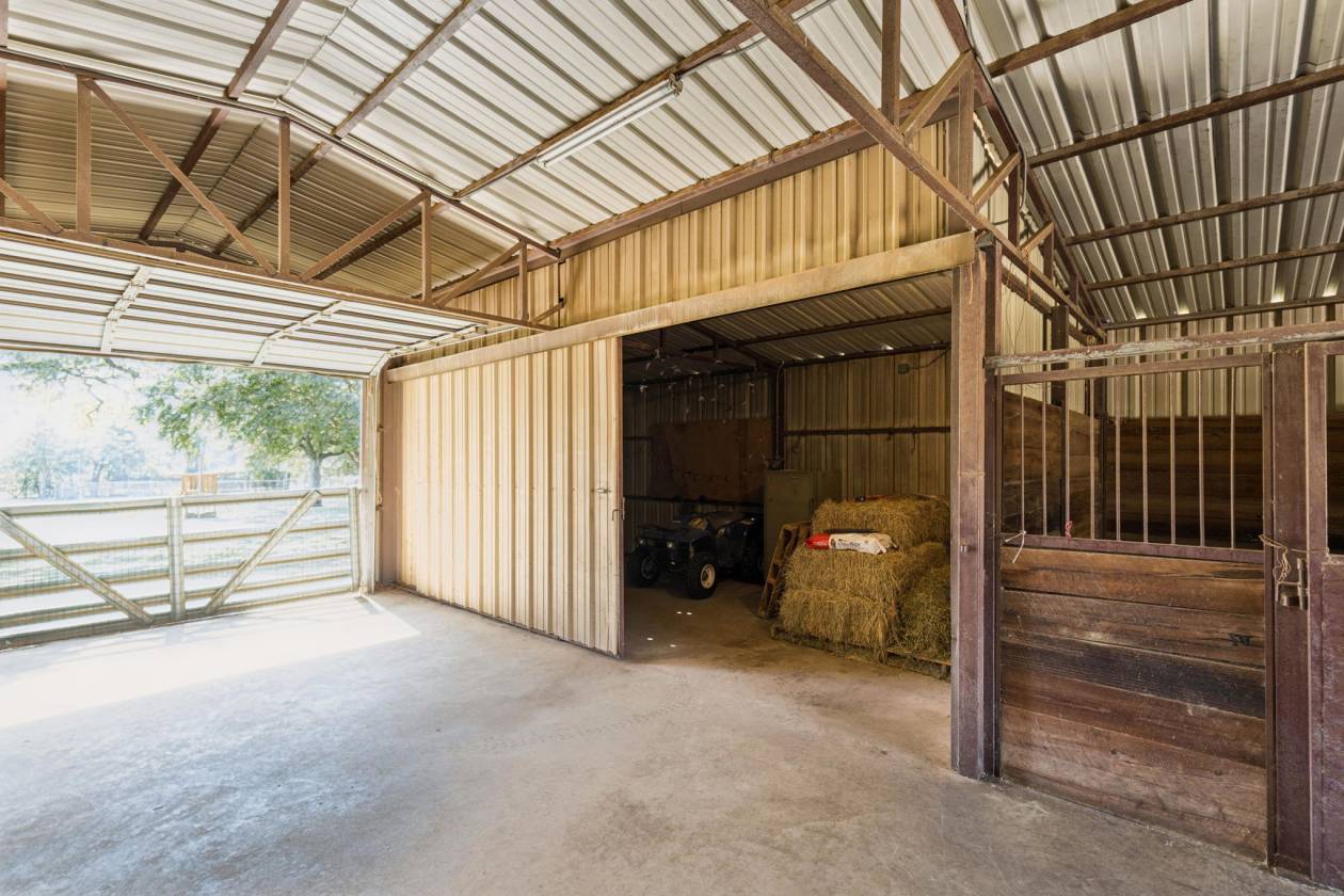 - 6-stall barn with tack room, a feed room, a loafing shed, fenced and cross fenced with pipe fencing, and has an area for lighted arena