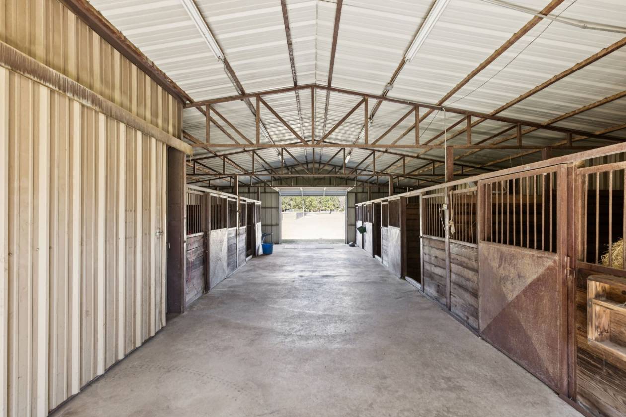 - 6-stall barn with tack room, a feed room, a loafing shed, fenced and cross fenced with pipe fencing, and has an area for lighted arena