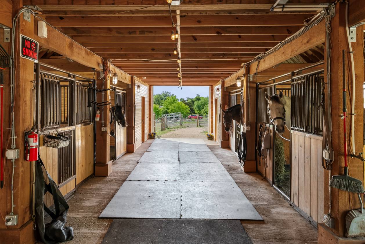 - Barn with four foam-padded stalls equipped with seamless rubber flooring, center drains, and outdoor paddocks, all lined with durable Priefert stall panels.