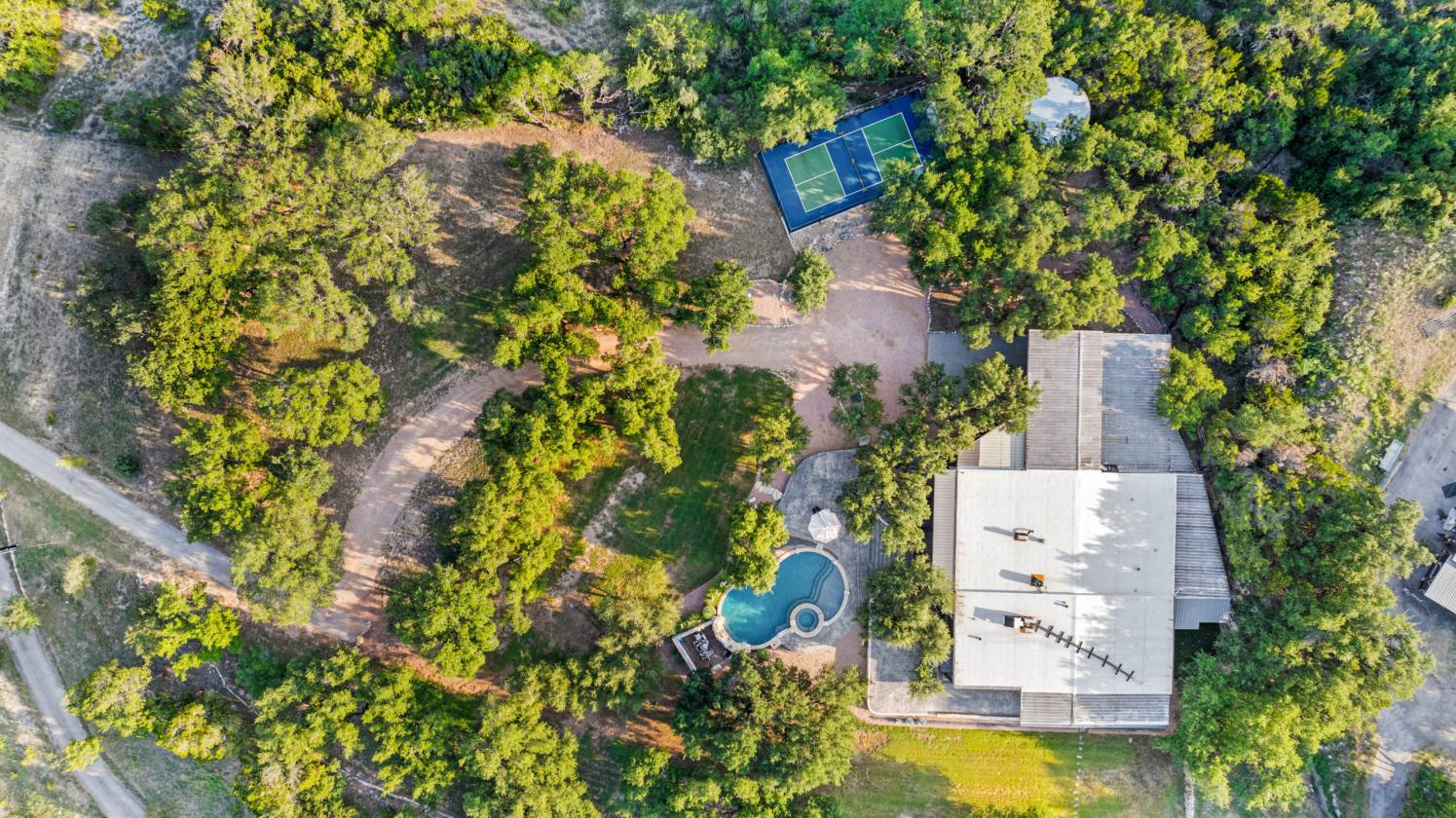 **Stunning 16-Acre Unrestricted Property with Pool, Pickleball, and Equestrian Amenities** Welcome to your dream retreat, an extraordinary 16-acre property that combines luxury, functionality, and natural beauty. Located in the heart of Hill Country, this rare gem offers endless possibilities—whether you're seeking a peaceful private estate, a world-class equestrian facility, or a venue for commercial ventures. With no restrictions, the potential is limitless. **Luxurious Home & Chef's Kitchen** The expansive barndominium-style home has been meticulously renovated and expanded to offer an open-concept floor plan that blends rustic charm with contemporary elegance. The chef’s kitchen is a culinary masterpiece, featuring: - Concrete countertops with a double island - Miele and Wolfe appliances, including a 6-burner gas cooktop with griddle, pot filler, and steam oven - Two dishwashers, warming drawer, microwave, and a full prep sink with multiple faucets - Custom barnwood cabinetry imported from Tennessee The bright and airy living spaces flow seamlessly into the spacious primary suite, which boasts expansive closets, a multi-head walk-in shower, spa tub, heated bidet, and contemporary glass doors that frame panoramic views of the surrounding landscape. The secondary bedrooms offer large, private retreats with ensuite baths, one of which includes a steam shower for ultimate relaxation. **Incredible Outdoor Amenities** The property's outdoor areas are designed for both relaxation and recreation. - **Sparkling Pool & Hot Tub**: The pool features a splash deck, hot tub, and beautiful views of the surrounding trees and nature. - **Regulation Pickleball Court**: Enjoy friendly competition on your very own private court. - **Raised Garden**: For the green thumb, this garden is equipped with a railing and lighting for nighttime enjoyment. - **Landscaping & Lighting**: Mature trees and strategic lighting create a serene, private atmosphere ideal for hosting events or unwinding in solitude. **Equestrian Facilities** A true horse lover’s paradise, this property offers premium equestrian amenities, including: - **Comfort Stalls**: 3 oversized 14x16 stalls with 12-foot runs, auto water, and large tack room. - **Indoor Wash Stall & Grooming Area**: Well-lit with multiple fans to ensure your horses’ comfort. - **Round Pen & Riding Arena**: Located on the edge of a creek-fed pond for stunning views while training. **Additional Features** - **Speakeasy-style Bar**: A fun and unique addition, perfect for entertaining guests. - **Home Office & Loft**: A dedicated office space, plus a half-bath and additional living space in the loft. - **Central Fireplace**: Adds warmth and charm to the heart of the home. - **Fitness Room**: Attached to the house with its own bathroom for convenience. **Sustainability & Systems** - **Water**: 38,000-gallon rainwater collection system for house and pool, supplemented by an irrigation well. - **Septic**: Two Travis County-approved systems—one for the house and one for the barn. - **HVAC**: Seven split units provide consistent temperature control throughout the home and barn, including a system for the water equipment room. **Commercial Potential** In addition to its use as a private estate, this property’s zoning and amenities make it ideal for a variety of commercial ventures. Picture a high-end restaurant, luxurious spa, wedding venue, brewery, or distillery—all with unparalleled Hill Country views and access. **Prime Location & Area Amenities** This property is centrally located, just minutes from the following: - **Travis Club** - **Wineries, Breweries, and Distilleries** - **Public and Private Golf Courses** - **Tennis and Pickleball Facilities** - **Hill Country Galleria** - **BSW Medical Complex** - **LTISD Schools** With two points of access via Bee Creek Road and Kathy Lane, this property offers both privacy and convenience. Whether you're dreaming of a private family estate, an equestrian retreat, or a unique commercial venture, this stunning 16-acre property is waiting for you. Schedule your private tour today and step into a life of luxury and opportunity!