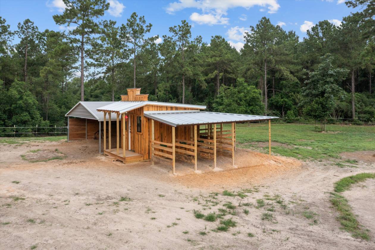 Experience the ultimate country lifestyle in this pristine 2022 manufactured home, beautifully situated on 11+ cleared acres perfect for horses, cattle, goats, or chickens. Designed with comfort and functionality in mind, this customized floorplan features 3 bedrooms, 2 baths, & spacious living areas. The home’s well-appointed kitchen and open concept layout make it ideal for entertaining or relaxing while enjoying immaculate views of the surrounding landscape. Equestrians will delight in the 4-stall horse barn complete with a custom-built tack room, plus there’s a dedicated barn/RV shed and a one-bay metal shop/garage to accommodate all your vehicles and equipment. When it’s time to unwind, immerse yourself in your refreshing above-ground pool with expansive sundeck, an outdoor shower, and large front and back covered porches that overlook the property’s impeccably maintained gardens & mature fruit trees. The expansive grounds are framed by dense woodlands, providing utmost privacy. All measurements are approximate and must be independently verified. Halo water filtration system servicing the private well (filterless), ensuring fresh and clean water. Custom tack room, barn, metal carport shading for horses, 20x40 shop, overhang 20x40, shop is insulated and has electric. All fencing is ready for horses or livestock. Lots of wildlife. Peach, pear and pecan trees. Shelves will stay with the shop. Appliances will remain with the home. The CR 3220 has been decommissioned by the county and no longer exists