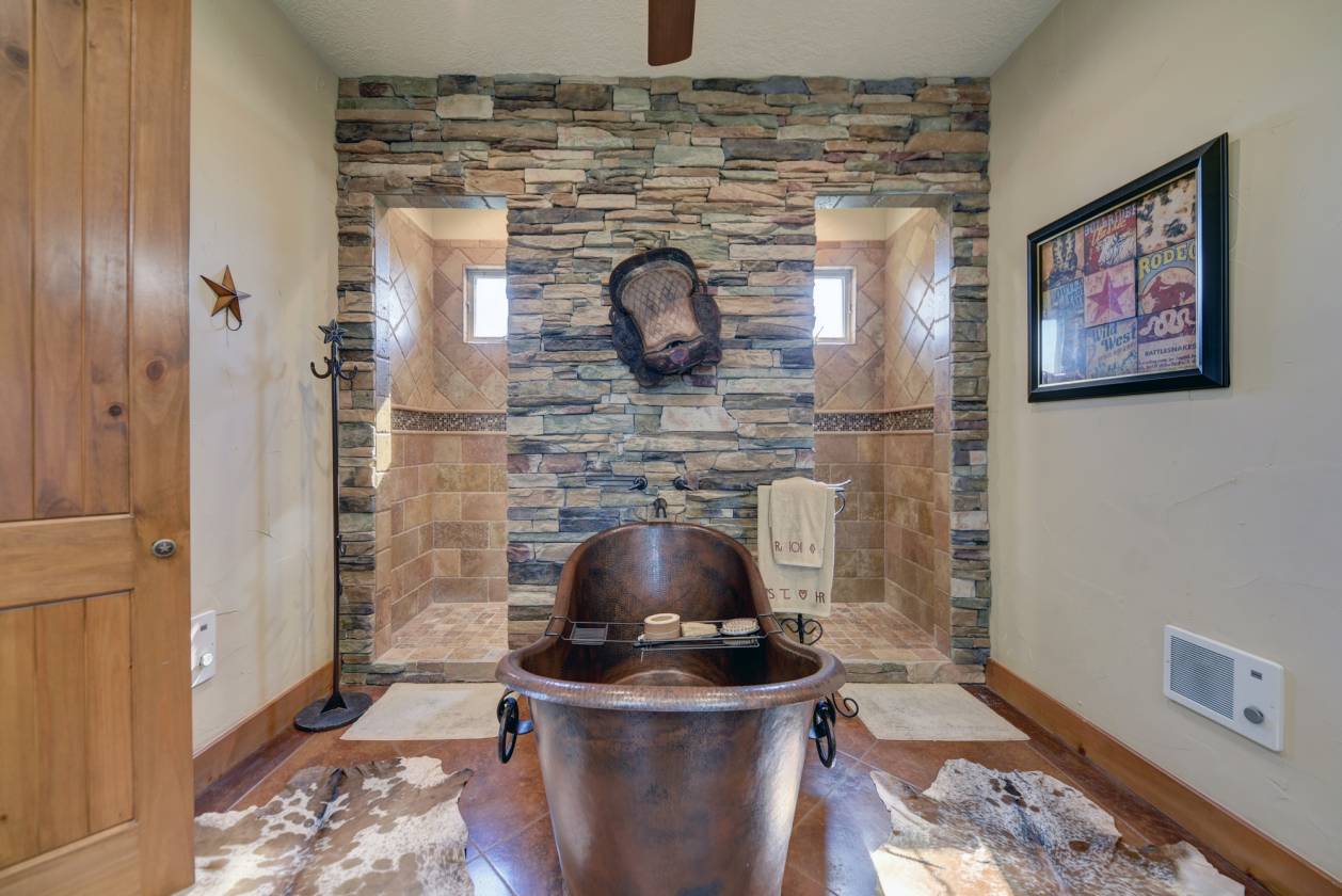 - Pool Bathroom, Copper bathroom sink, Texas star design, Glass shower, Entryway organizer/bench space, Exit access direct to back porch/pool area