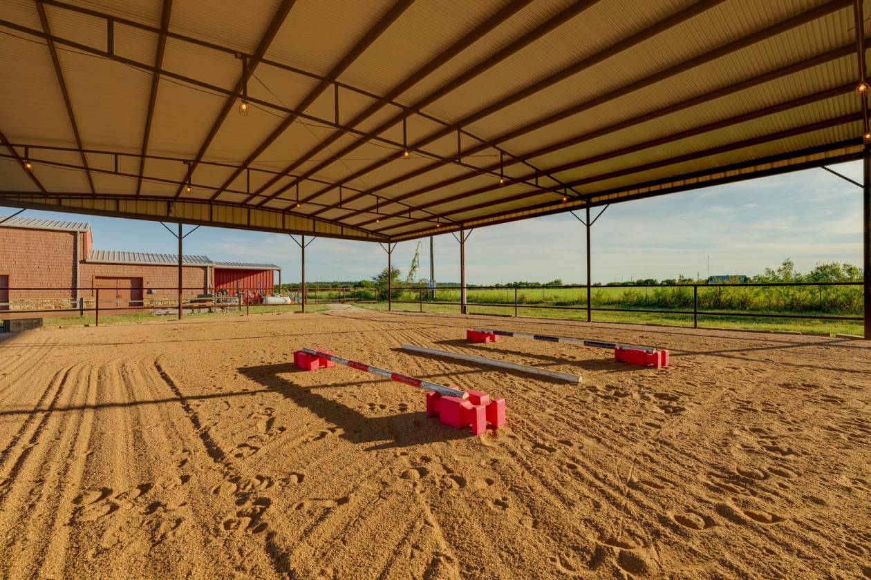 - 60x17 Meter Lighted Covered Arena - Just steps away, the professionally designed 60x17 meter lighted covered arena with professional-grade footing rivals top training facilities, providing year-round riding capabilities regardless of weather conditions. This versatile covered arena accommodates everything from daily riding and training to livestock shows, 4H/FFA projects, and could easily be configured for additional stalls if needed.