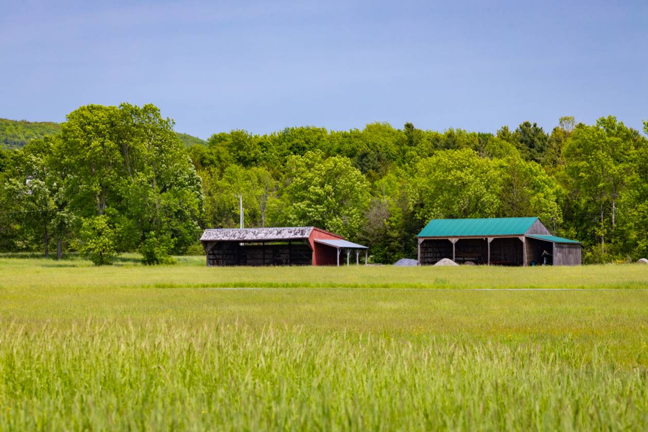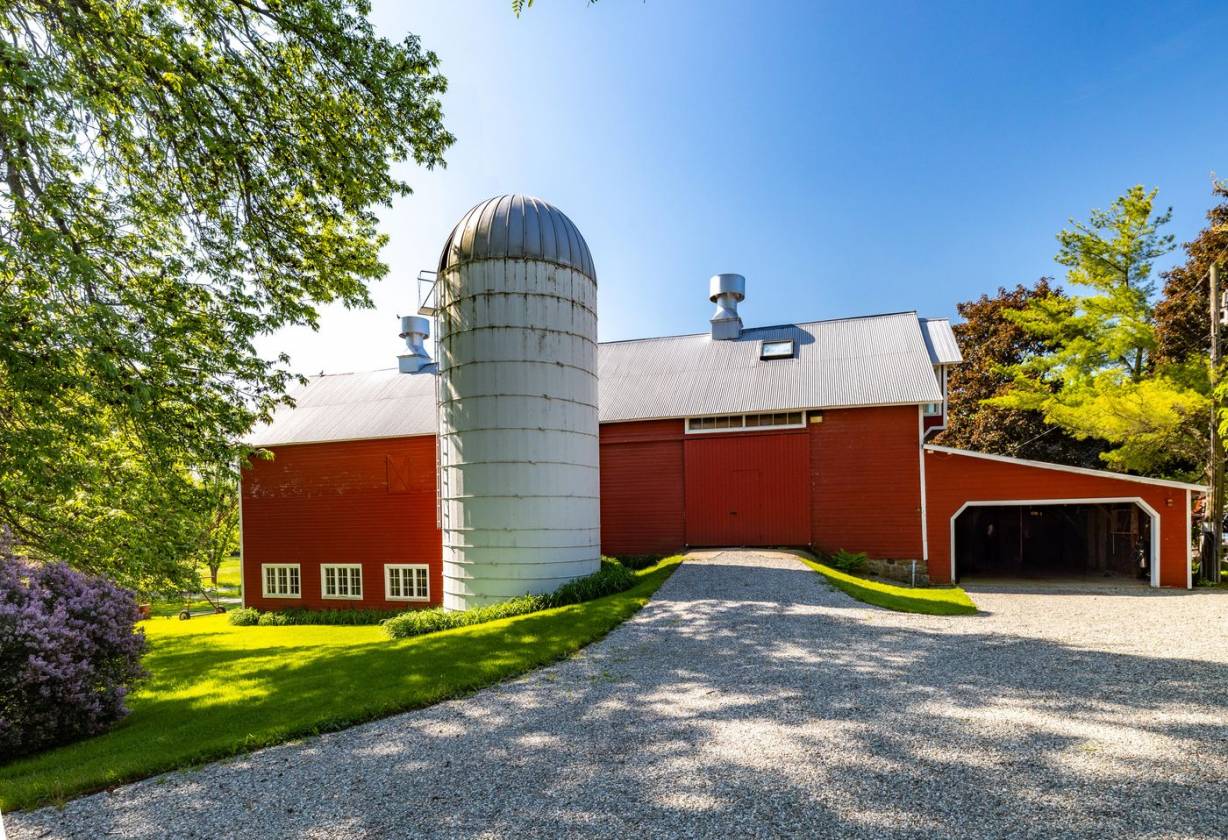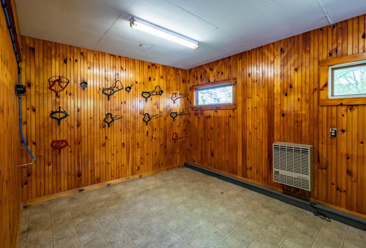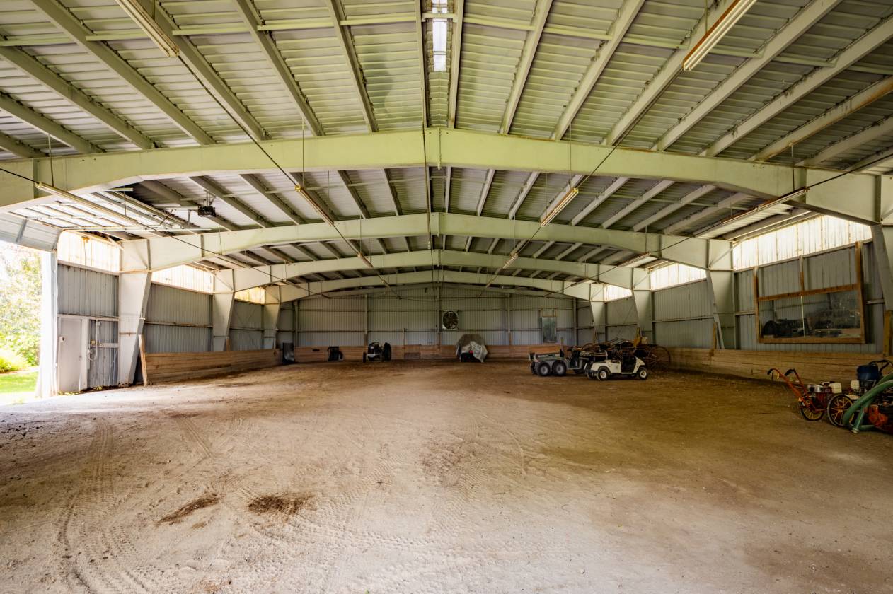 Few properties on the lake rival the scale and versatility of this one. At its heart is a full equestrian complex, including a 21-stall horse barn with two tack rooms and a regulation-size indoor riding arena. A separate red barn houses a former workshop, extensive hay storage, and a finished office with exposed beams and custom cabinetry. For aviation enthusiasts, a grass airstrip and 48-foot wood-sided hangar offer direct takeoff and landing access, a rare feature for lakefront property in Vermont.