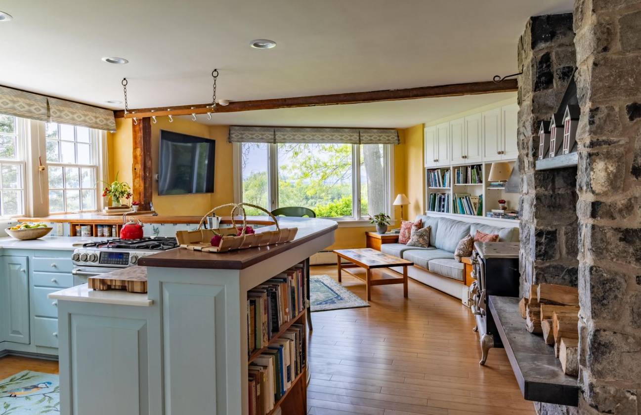 The 3,475± sq. ft. traditional-style estate blends classic design with authentic materials, old growth pine floors, hand-hewn beams, slate entries, and multiple woodburning fireplaces. In the main house, five bedrooms and four full baths, three half baths are spread across three levels, including a lower-level suite with a fireplace and a sauna located just down the hall. The kitchen, equipped with Viking appliances and a vintage Elmira woodstove, opens to a warm dining room with stone fireplace and sunroom with slate floors and skylights. The adjacent guest house includes two bedrooms, full bath, kitchen, and lakeview bedrooms, perfect for extended guests or caretakers.
