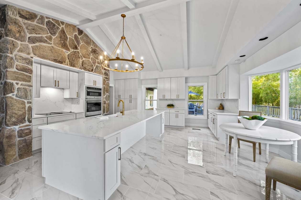 - Custom kitchen with porcelain tile flooring, Silestone countertops, stainless steel appliances, and expansive island