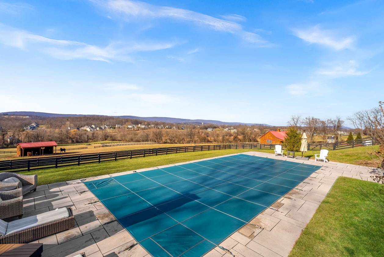 The inground, chlorine gunite pool, approx 30,000 gallons with heater, provides a private oasis for warm-weather relaxation, perfectly positioned to enjoy those incredible views. Enjoy the custom stone walk walk and design around the pool deck.