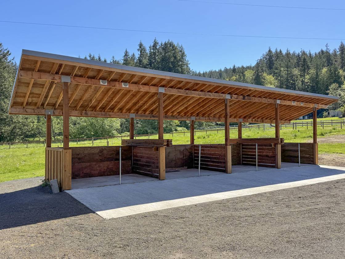 - 40’ x 15’ Hay and Bedding Storage Shed: 3-sided metal shed with gravel floor for durability and easy access for large hay deliveries