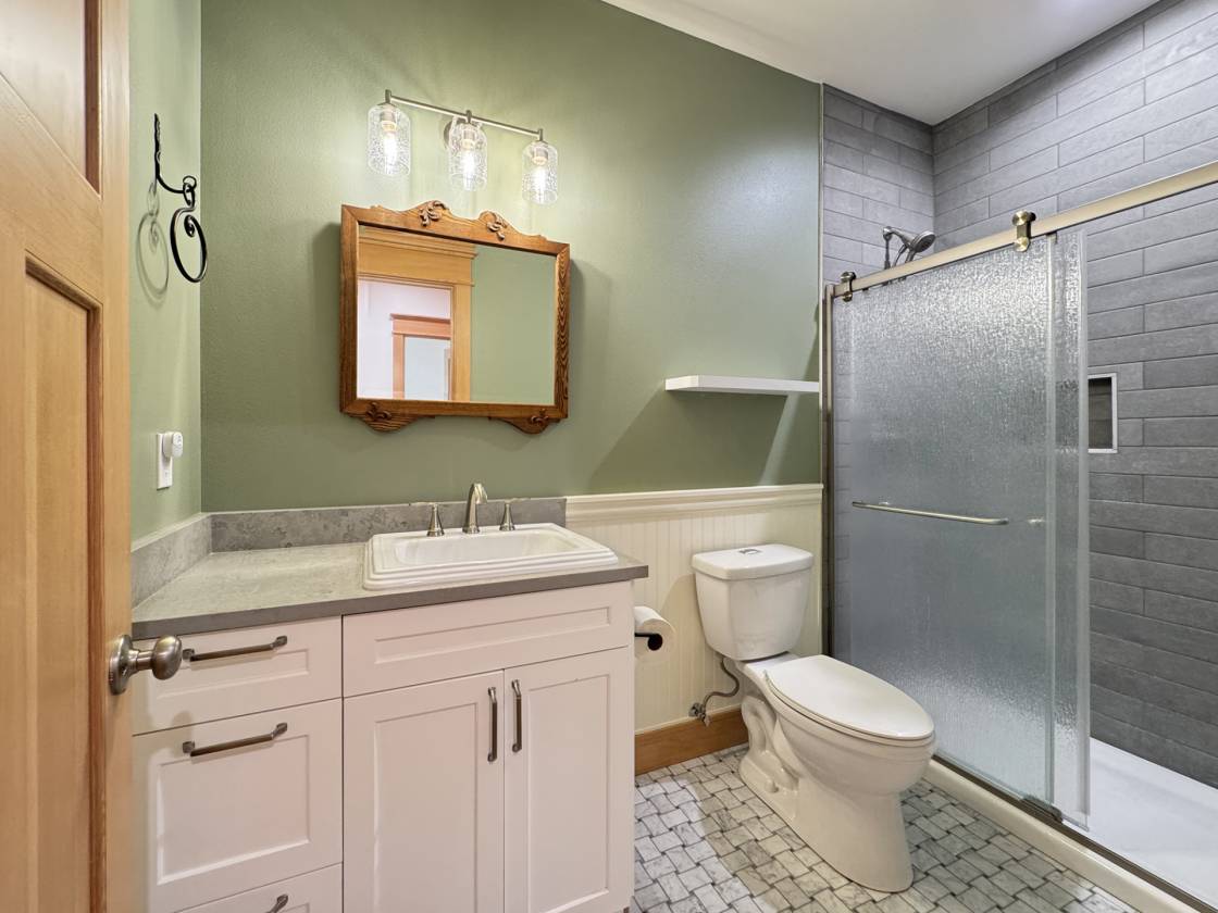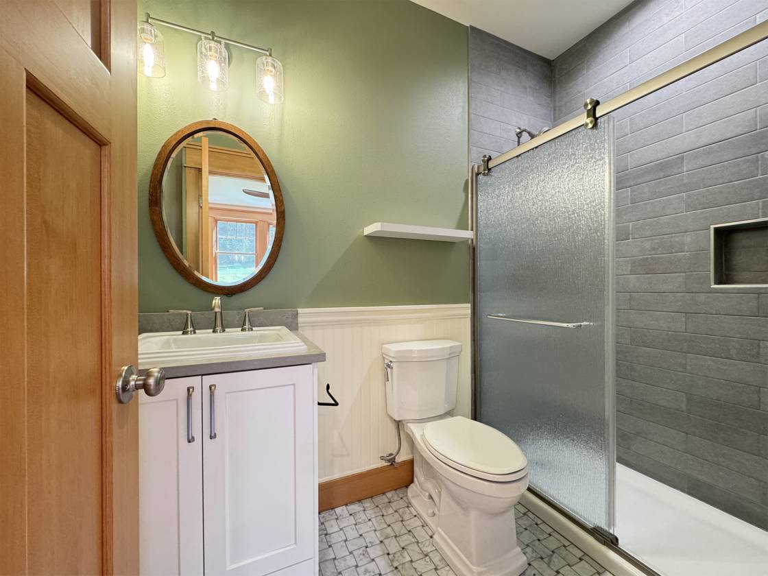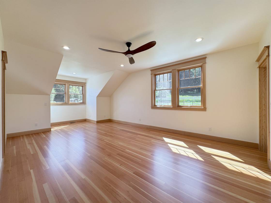 - Second-Floor Bonus Suite includes: 400-sqft bedroom/bonus room—bright, open space with reading nook, walk-in closet, and reversible ceiling fan— and Ensuite bath with a walk-in shower, marble basket-weave tile, antique mirror, and hand-forged custom accessories