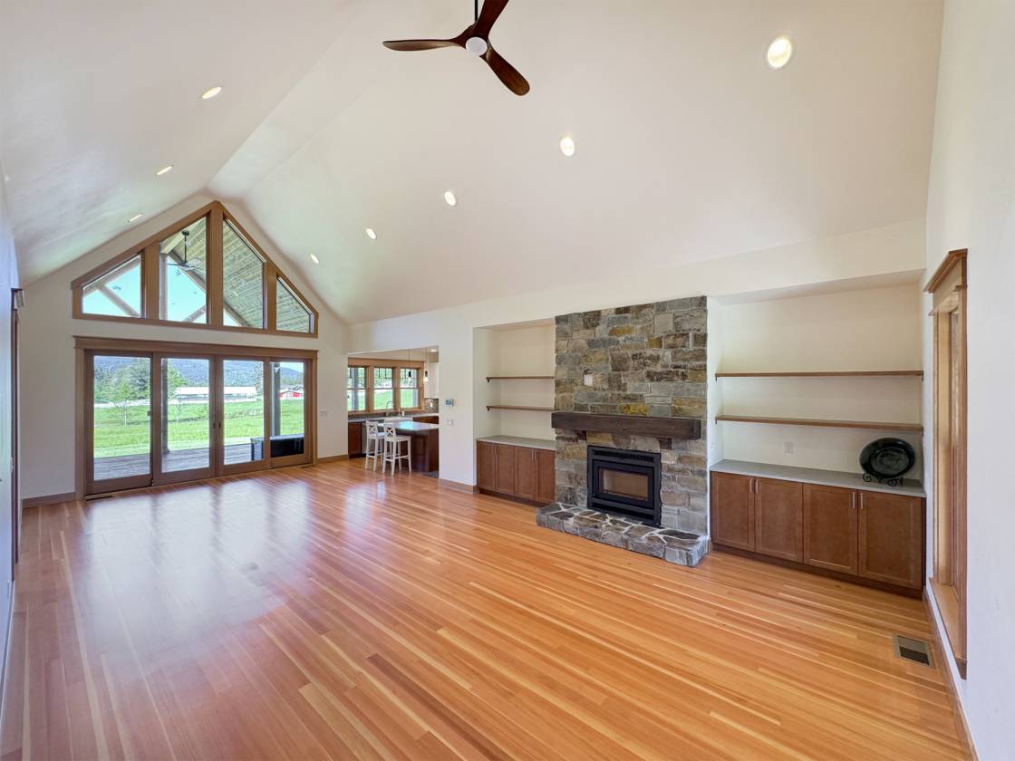 - Custom Montana Stone Fireplace with high-efficiency woodstove insert that can heat up to 2,400 sqft