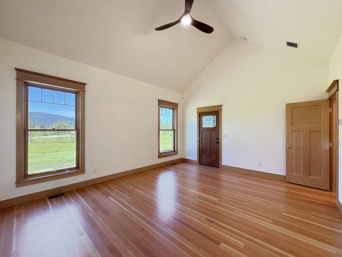 - Sliding fir doors lead to the oversized back deck, offering panoramic views of the pastures and valley