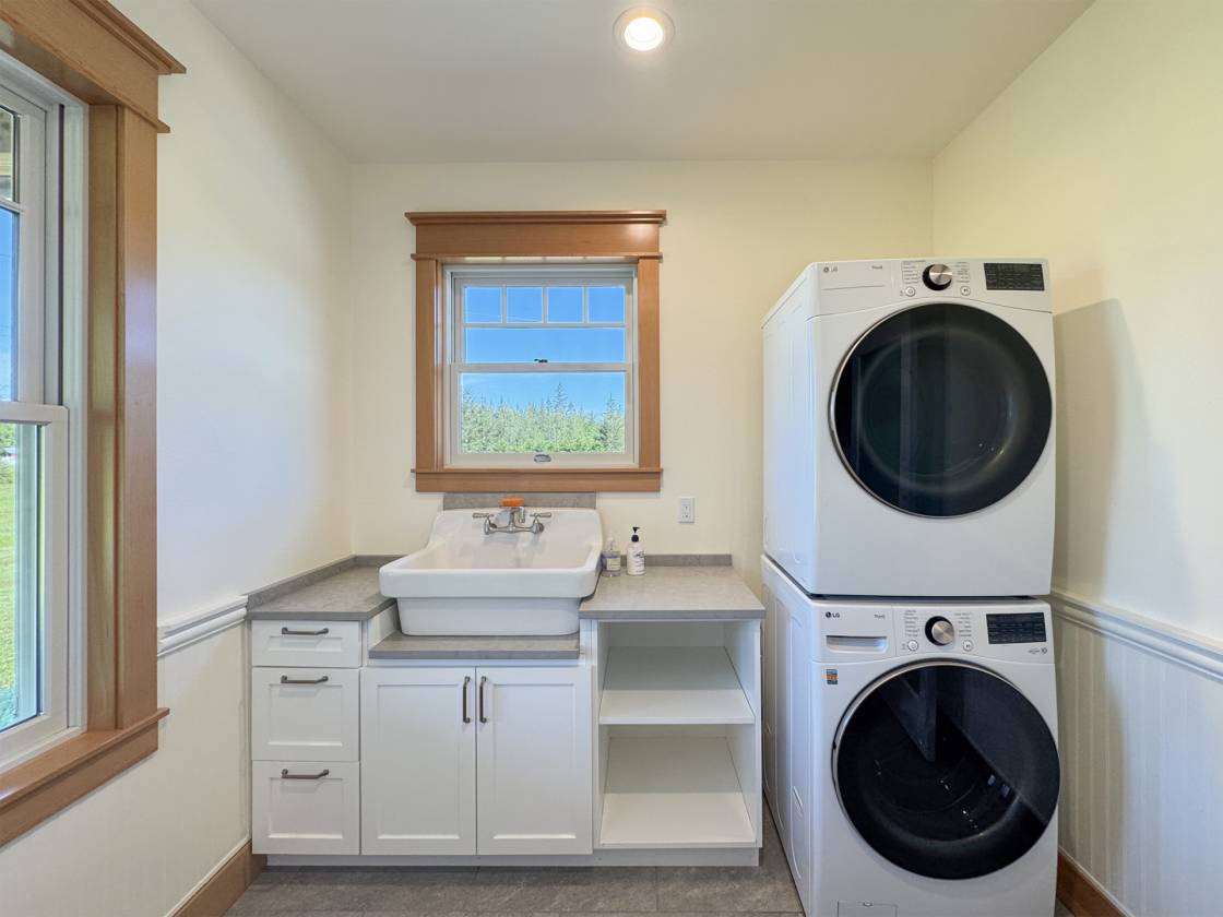 - Laundry Room includes: brand-new, high-capacity washer and dryer, large farm sink, built-in storage, laundry folding area, and space for a large dog crate