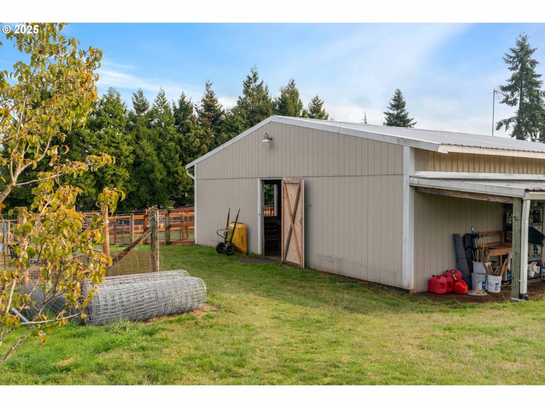 - 36’x36’ barn with 3 stalls (one oversize for mare, foal, or stallion), two 18’x24’ turnout paddocks, one 30’x30’ paddock, tack room, and storage