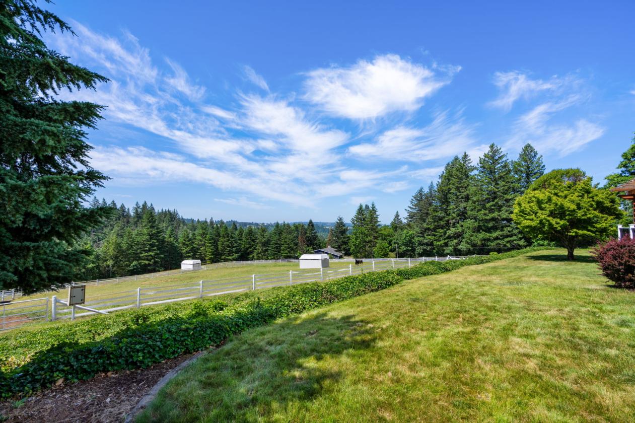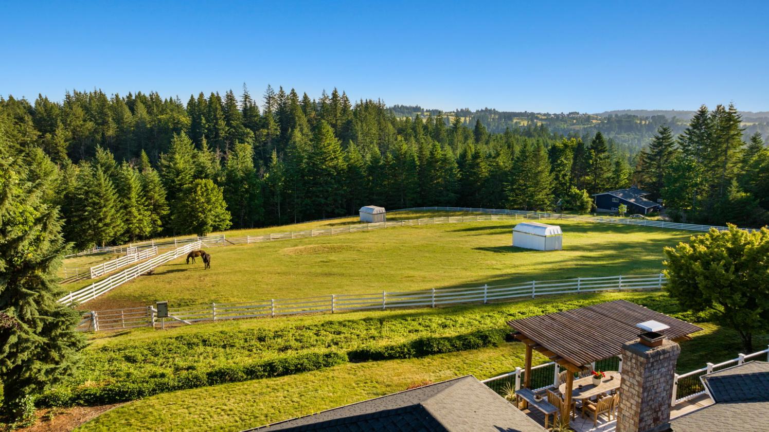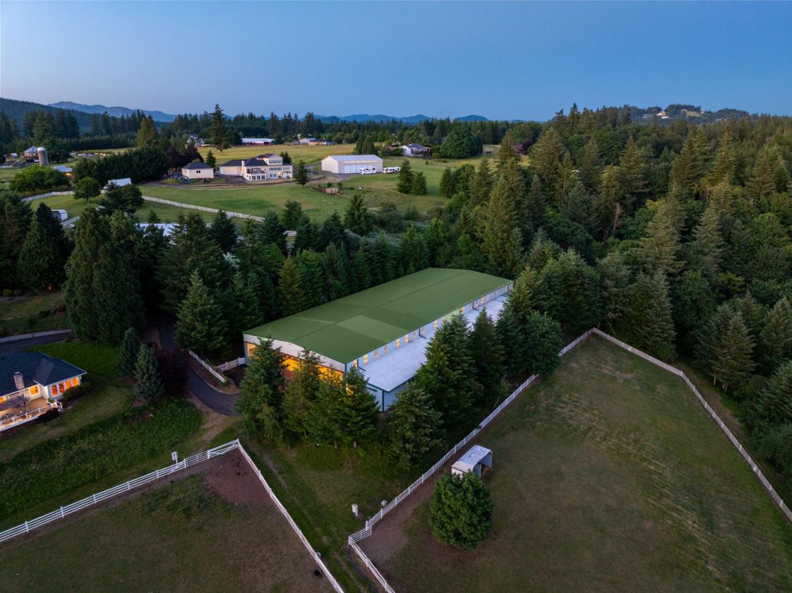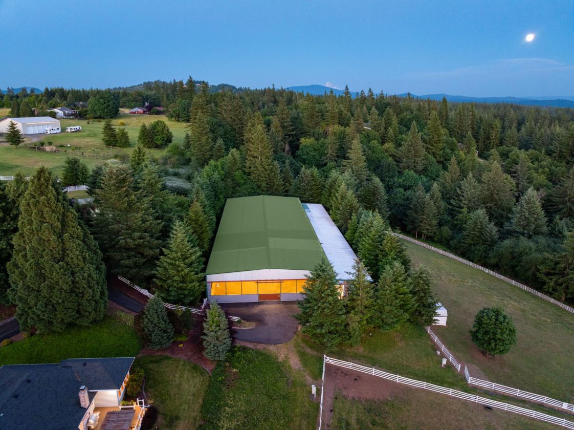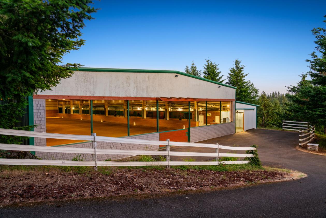 Situated on 10.5± private acres with scenic views and a gated circular driveway, this remodeled 3,596 SQFT single-level home features a modern Northwest design with a gourmet kitchen, granite countertops, high-end appliances, and a large island flowing into a vaulted Great Room with direct access to a ~1000 SQFT deck with LED lighting and speakers. Interior highlights include maple hardwood floors, vaulted cedar ceilings, woodclad windows, a spacious primary suite with dual closets, walk-in shower, jetted tub, and deck access, plus additional bedrooms, office/den, bonus room, and a hidden safe room, along with fiberoptic internet and CCTV. The equestrian facilities include a world-class 75x208 clear-span indoor arena with a sprinkler system, 10 oversized 12x17 warmblood stalls with automatic waterers, a heated wash rack, and a heated tack room with hot/cold water. The property also offers five large fenced pastures with Centaur® fencing, fiberglass-covered shelters, a ~70 round pen, and a multi-bay shop with 220V power, hot water, and ample space for hay, trailers, and equipment, all located just ~30 minutes to PDX and 5 minutes to shopping and dining.