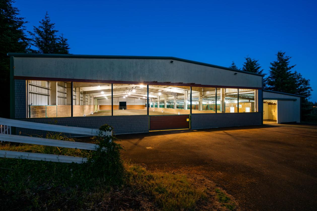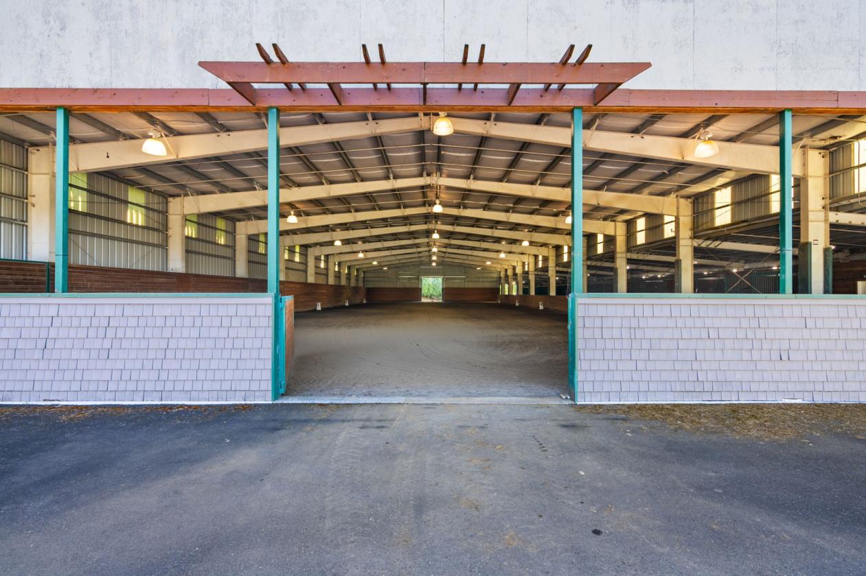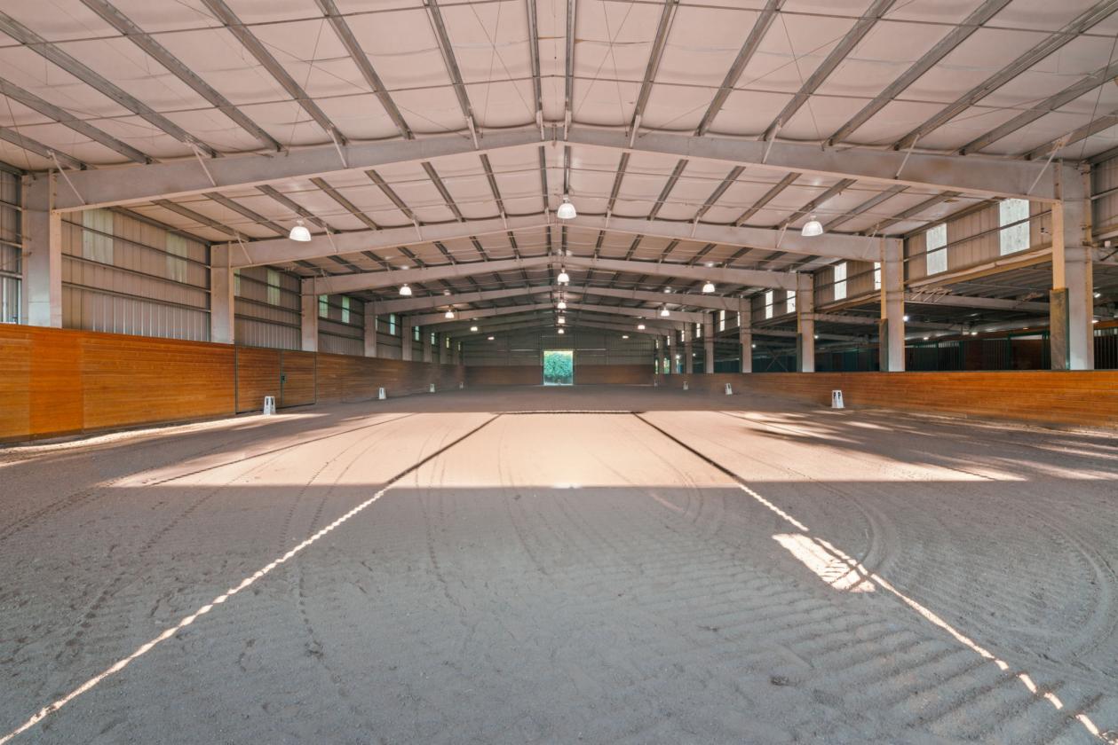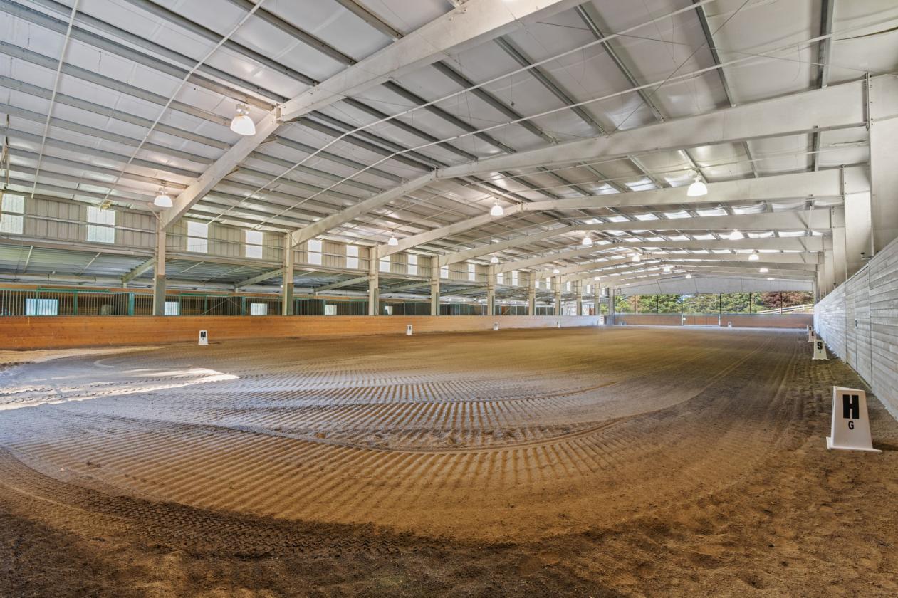 - 75x208 ft clear-span indoor arena with a sprinkler system (dressage footing), 10 oversized 12x17 stalls with automatic waterers, heated wash rack with hot/cold water, and heated tack room.