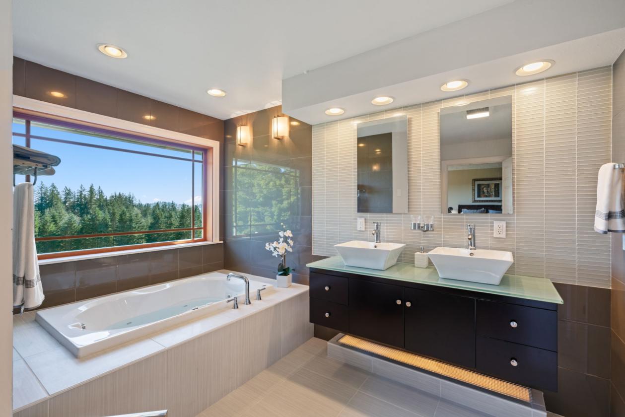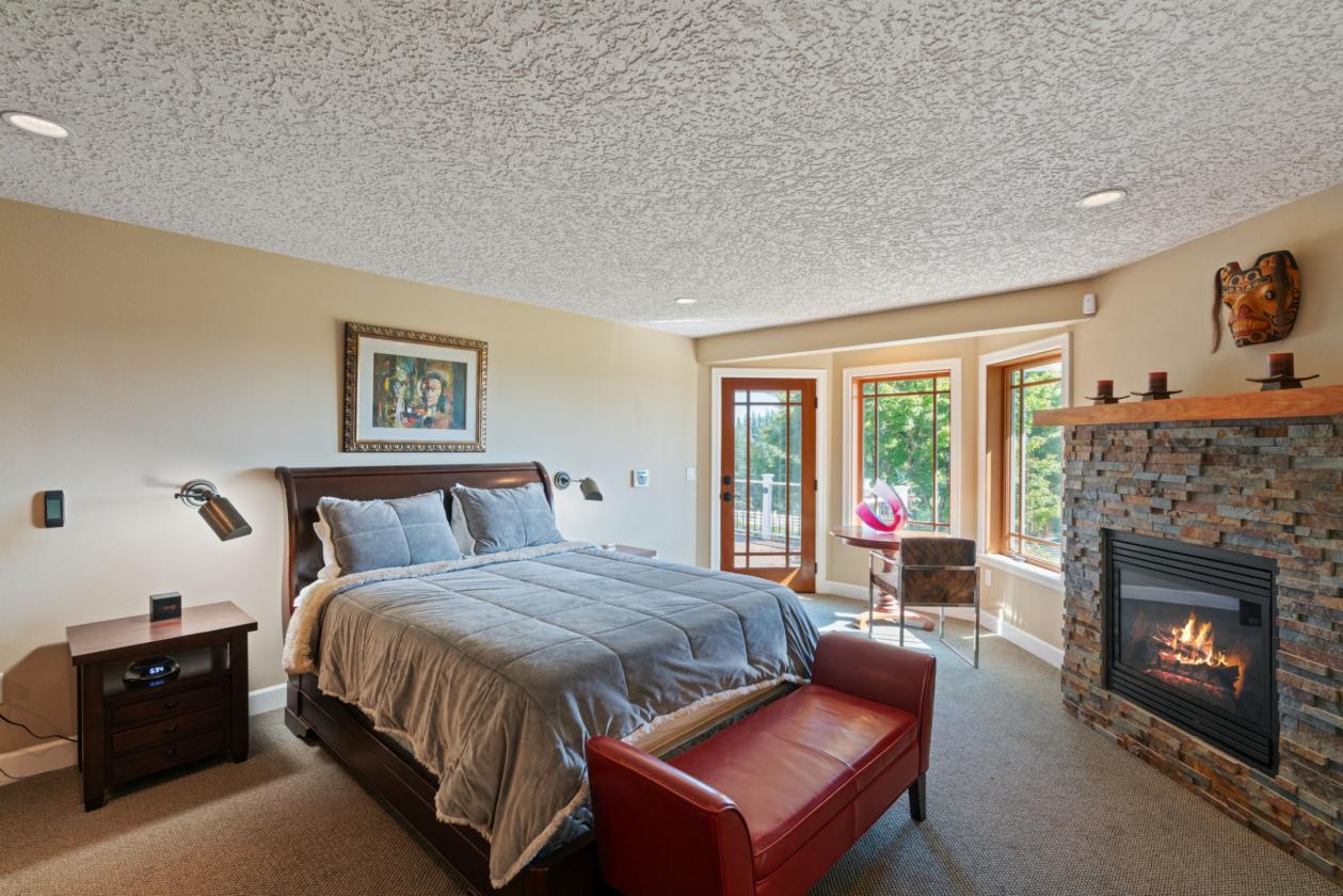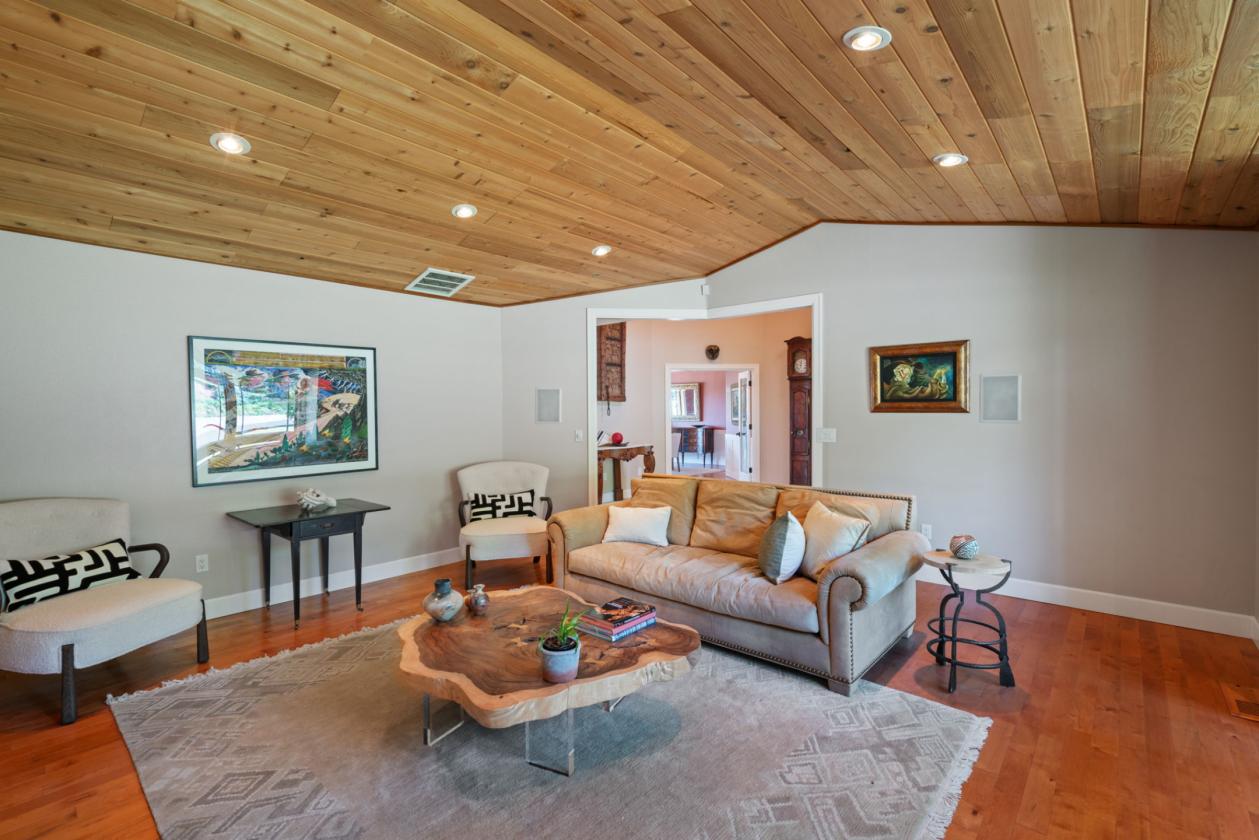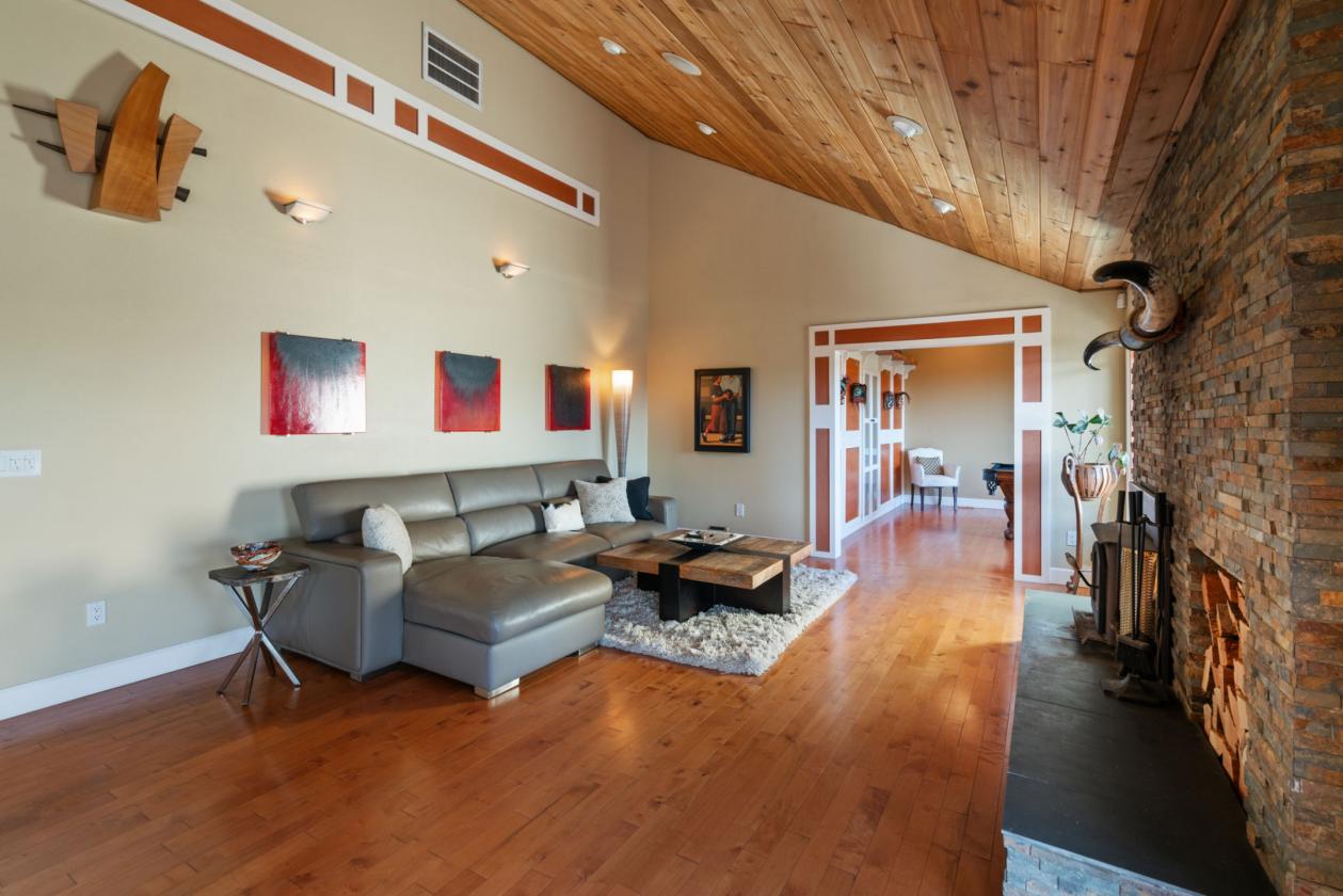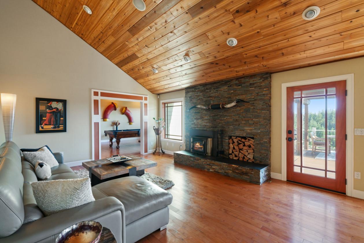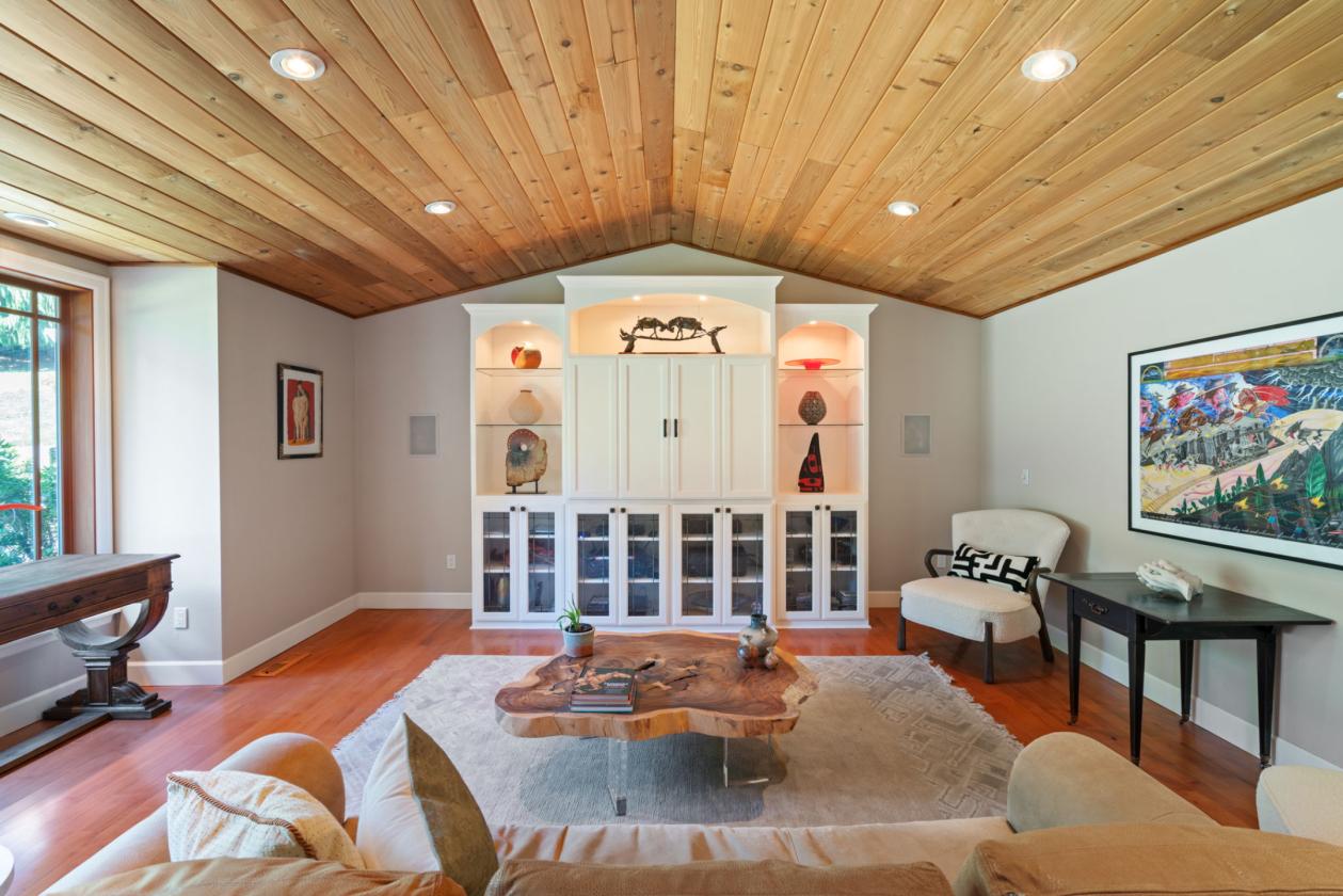 - Maple hardwood floors, vaulted cedar ceilings, and wood-clad windows throughout.