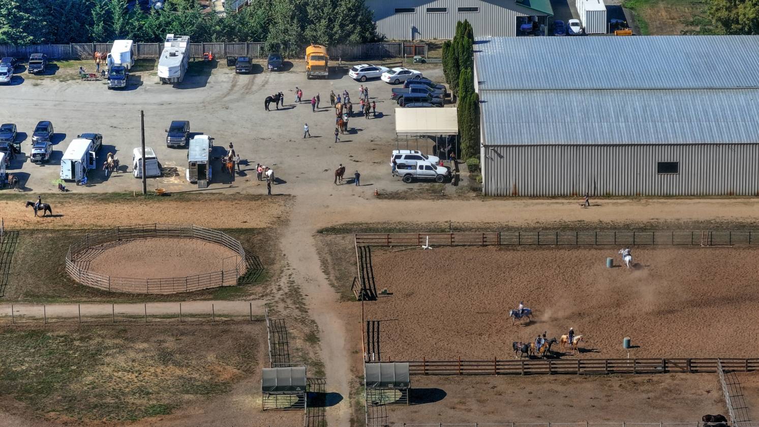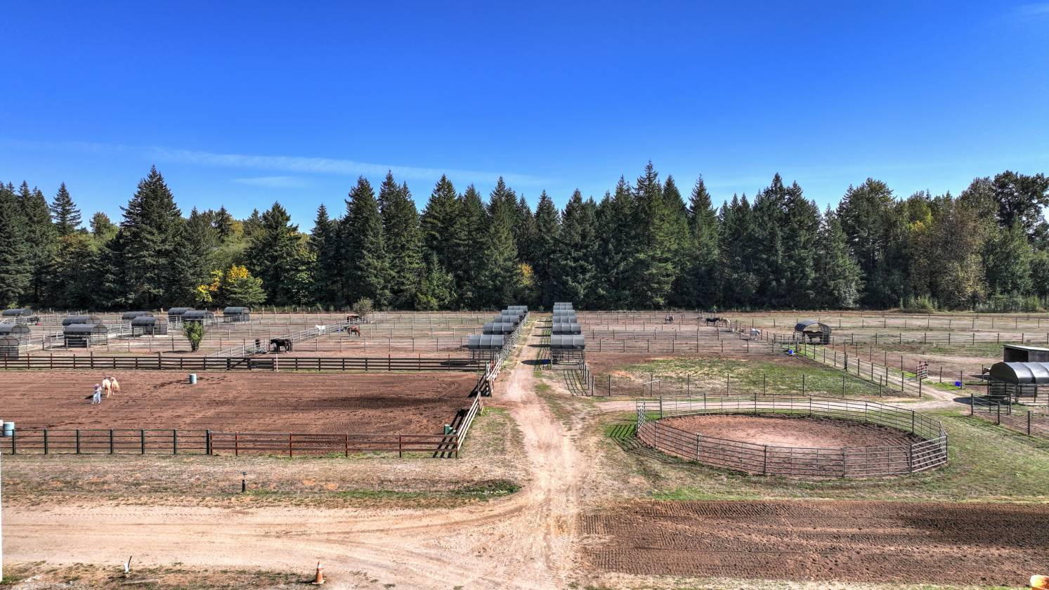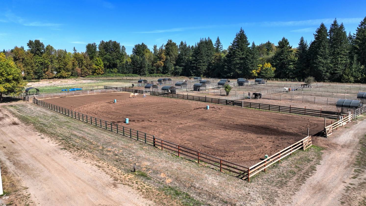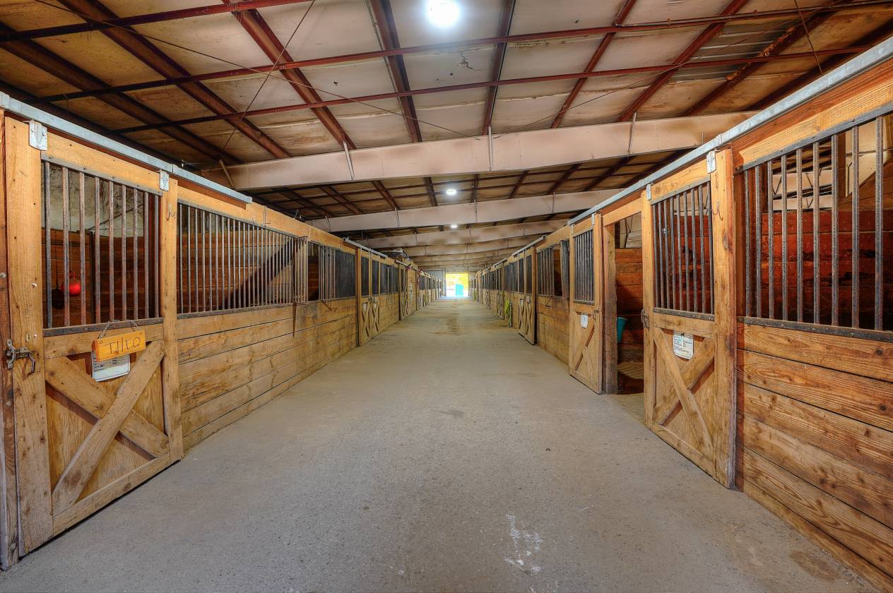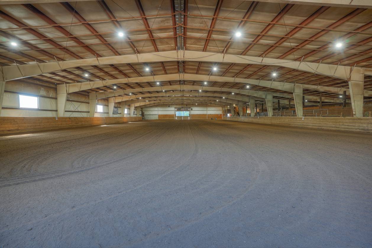 - 220 x 100 Indoor arena with event office, 3 tack rooms, 1 feed room, hay storage, 2 heated bathrooms. 34 stalls total in 2 barns. 265 x 115 outdoor arena. Round Pen. 28 paddocks with shelters. 1/2 Mile Track. Hot & Cold wash rack, vet/farrier bay combo. Shavings bin. Cattle pens. bleacher seating for events.