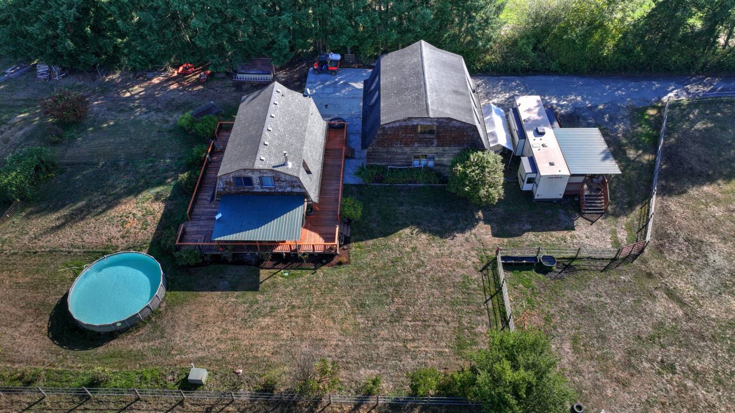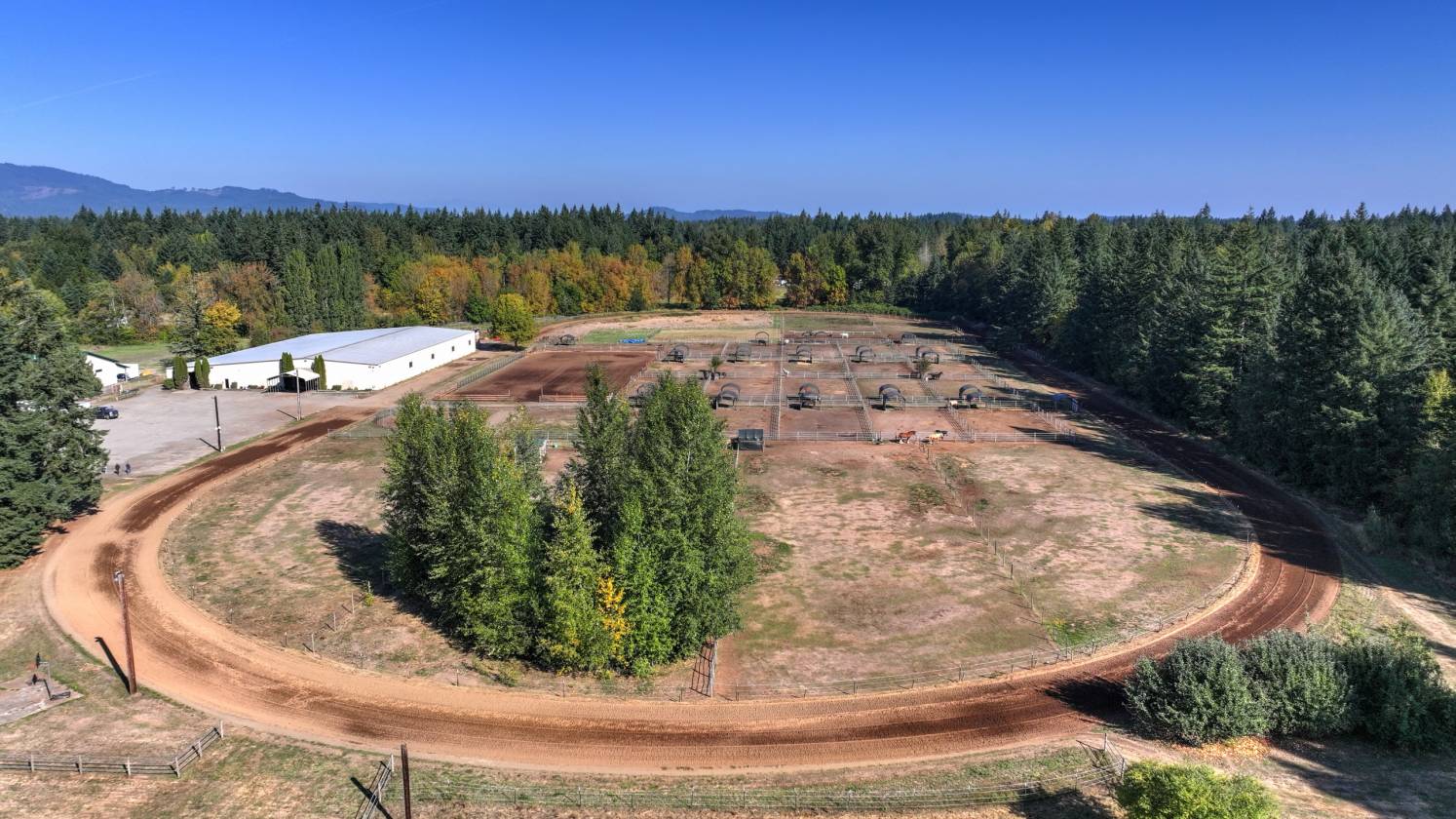 - 37.26 Acres. Equestrian Facility with Hay Field, 1/2 mile track, seasonal creek, fruit trees, wooded, pasture, garden space, covered picnic area, playground area, 2 RV hook ups, Ample lighted parking for events. Located on a dead-end street