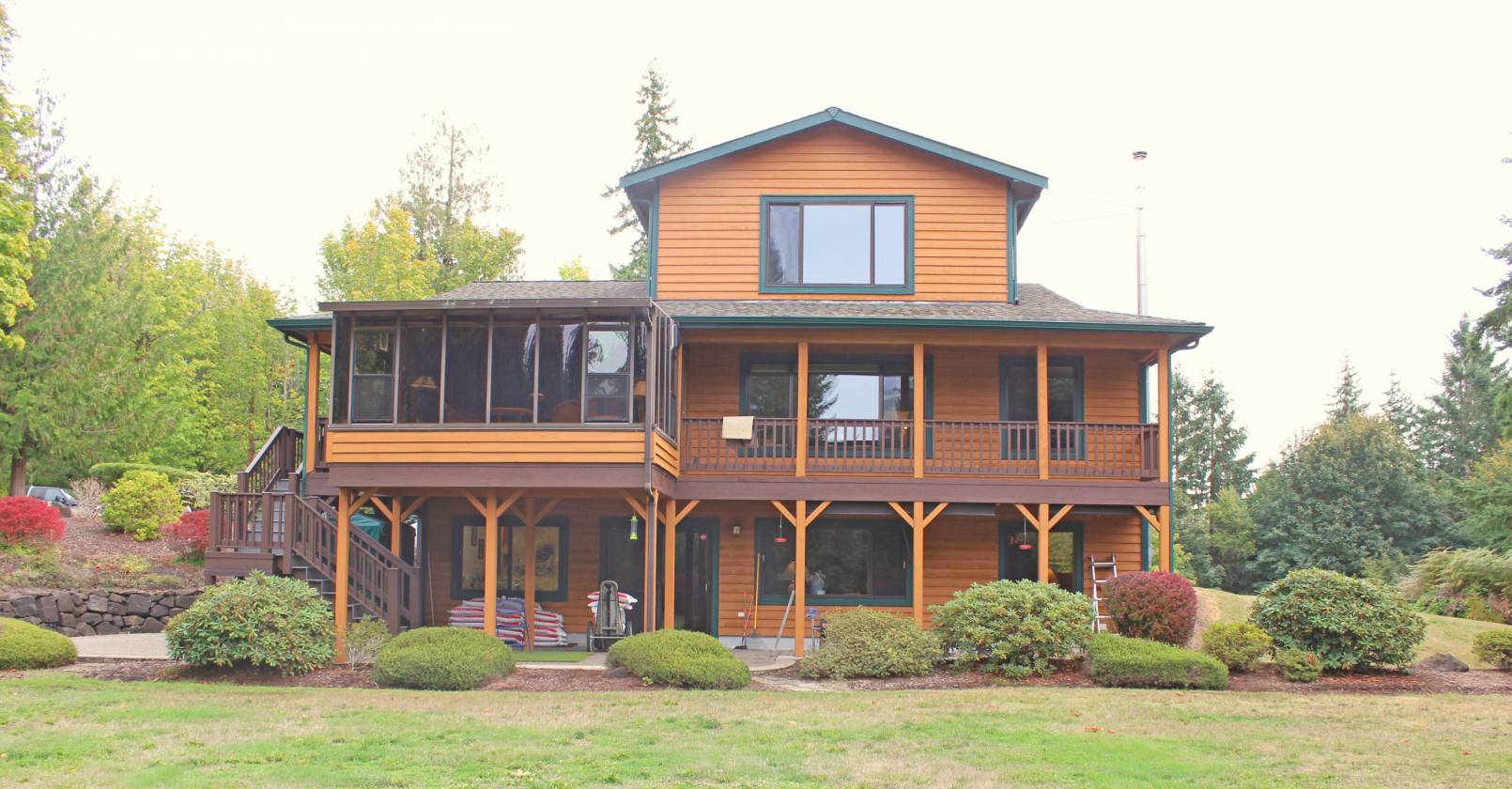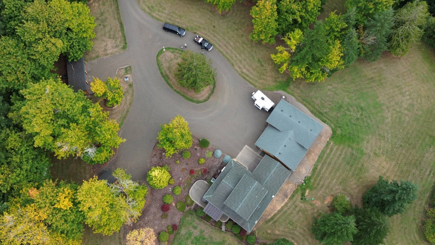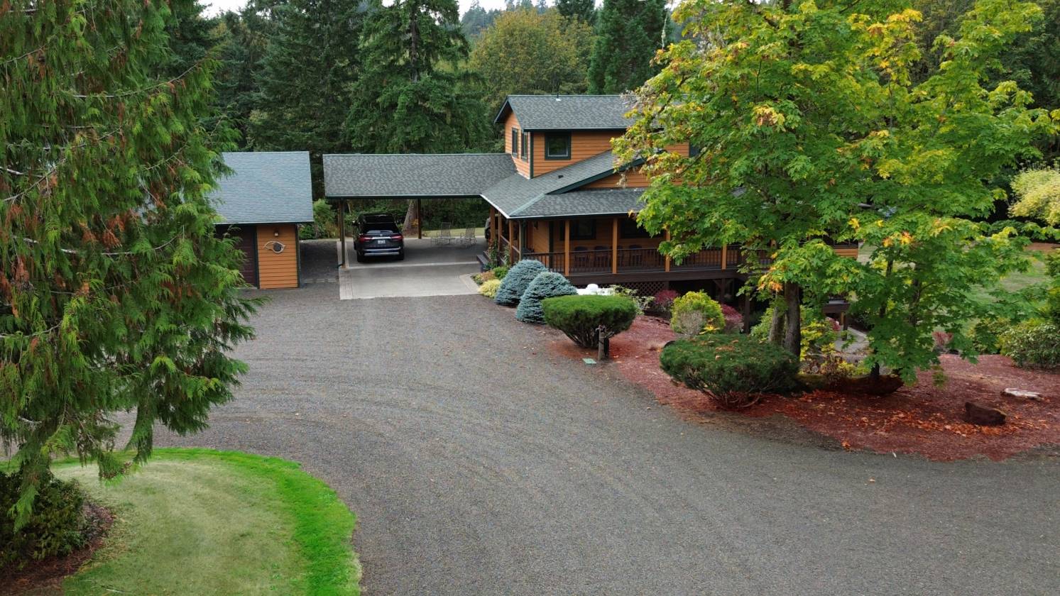 - Lush landscaping, tall trees