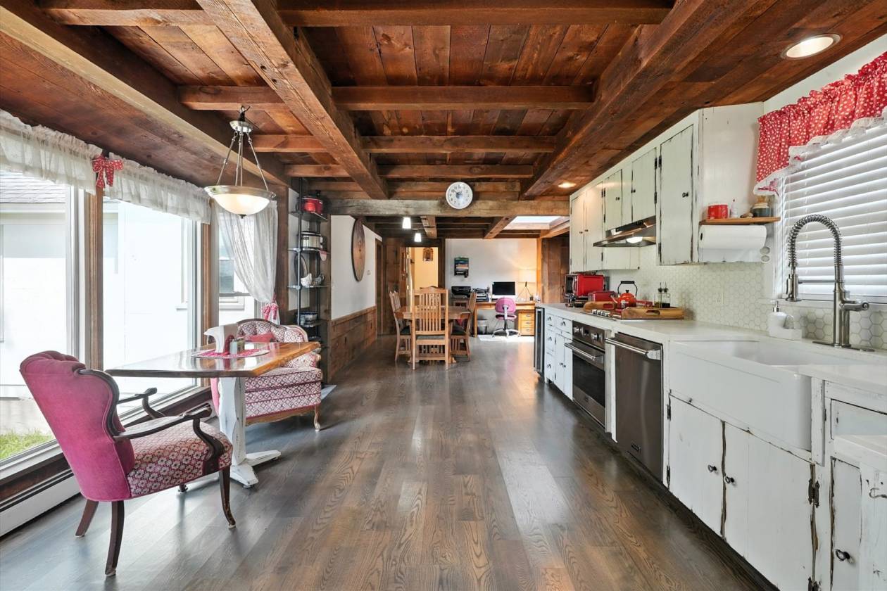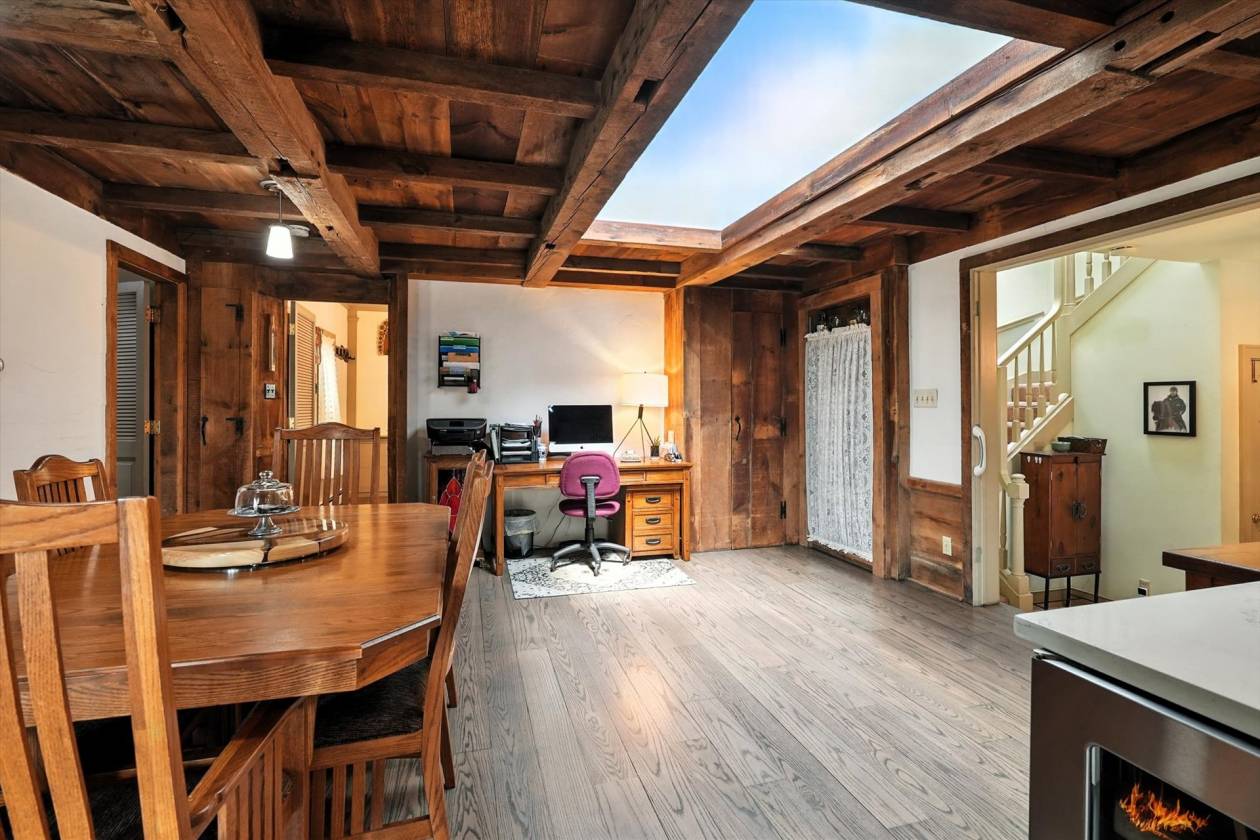 - Dark Hardwood Floors — Rich, deep-stained hardwoods run throughout the main living areas, adding drama, warmth, and a polished rustic elegance. The floors contrast beautifully with lighter walls or stonework.